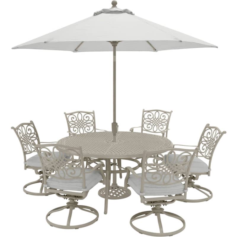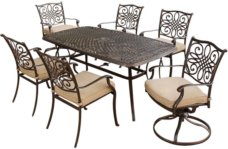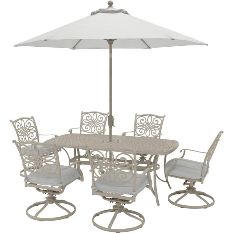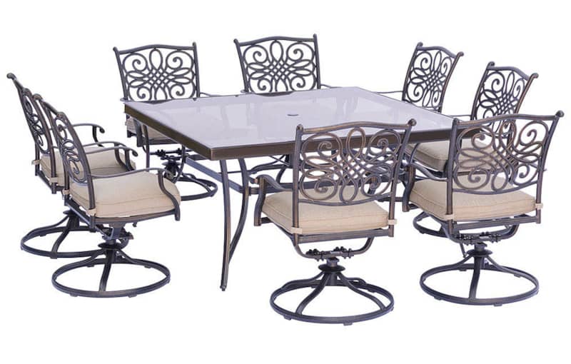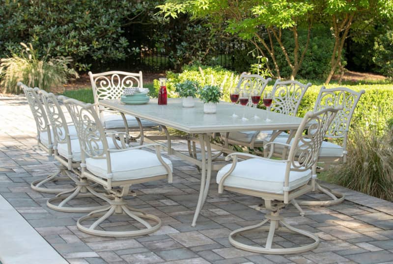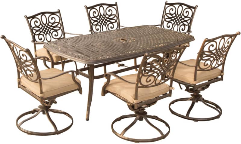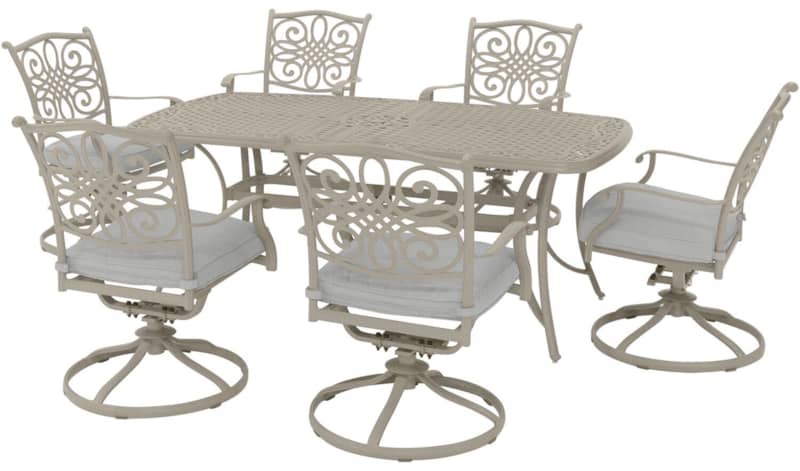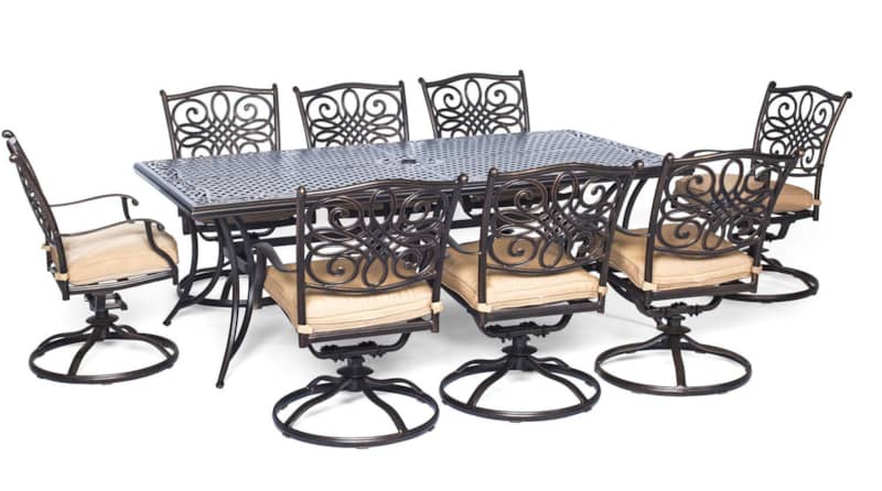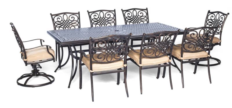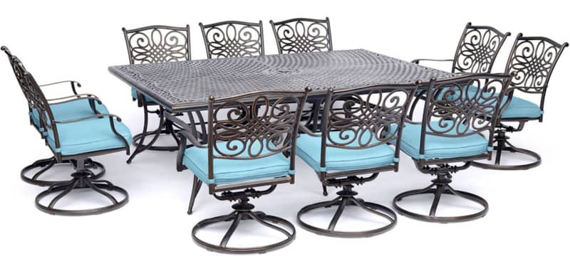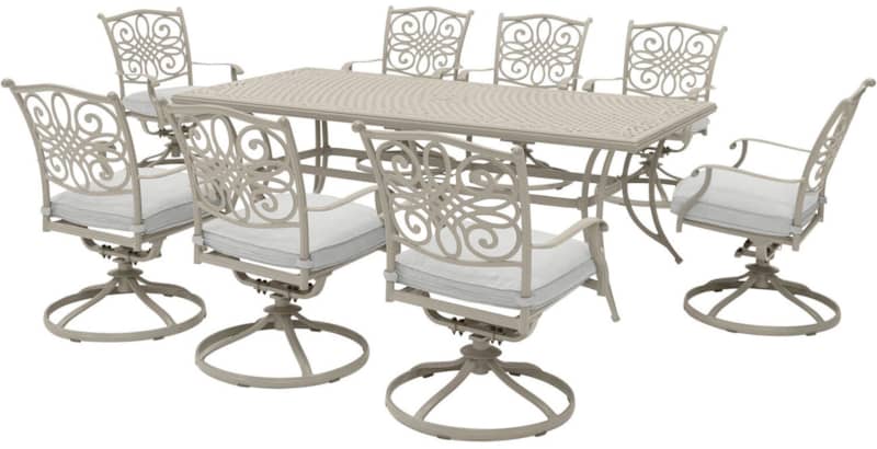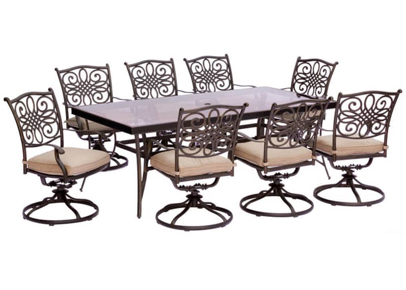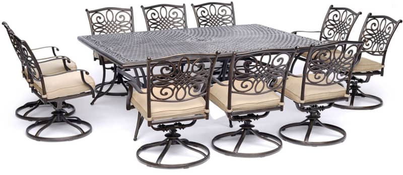 Hanover Traditions 11-Piece Outdoor Dining Set In Tan/Cast With 10 Swivel Rockers, 60×84″ Cast Table
