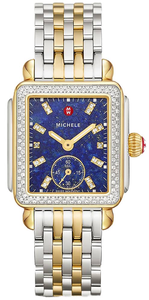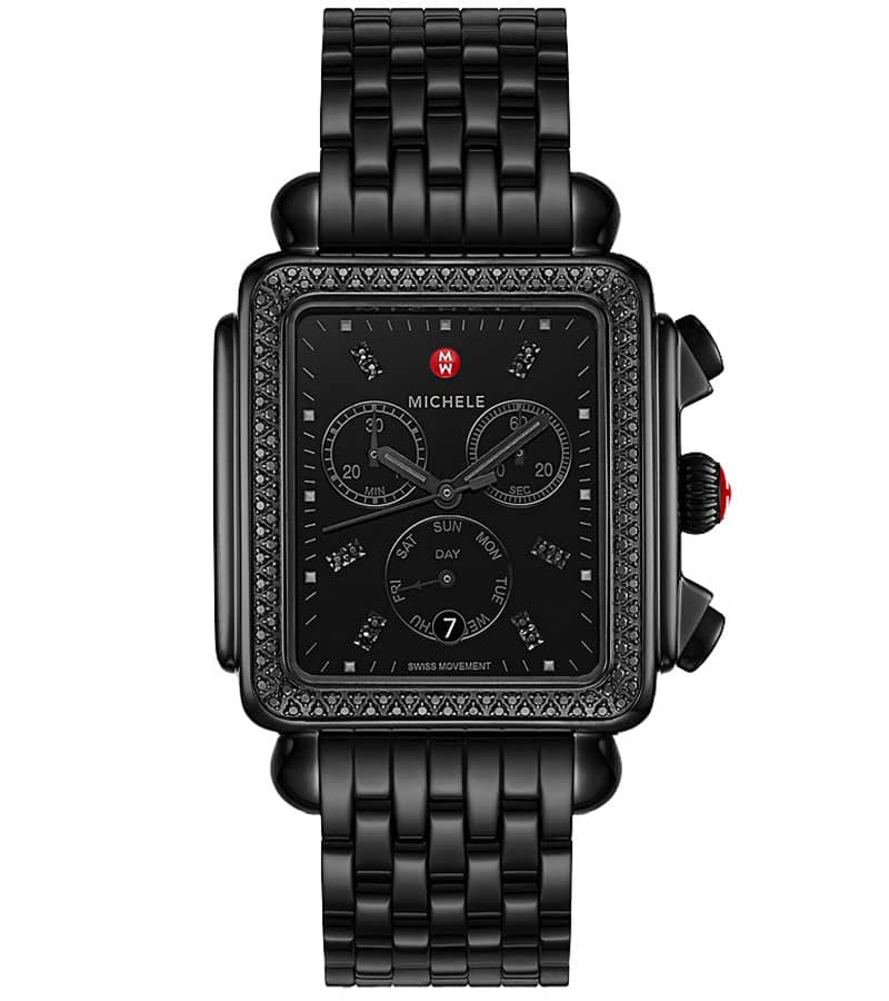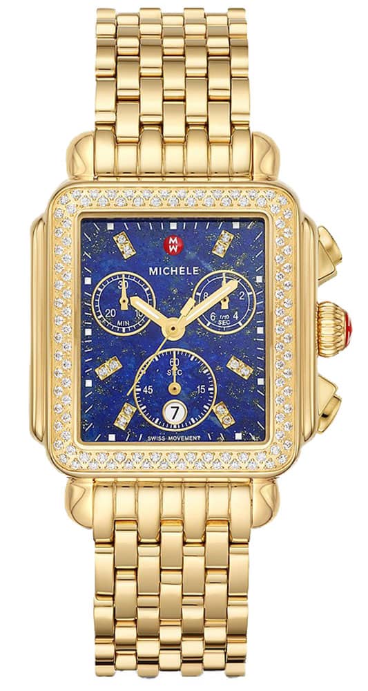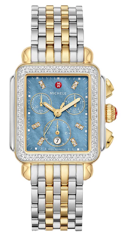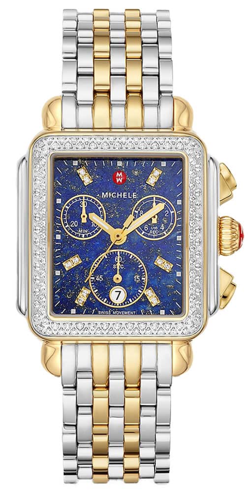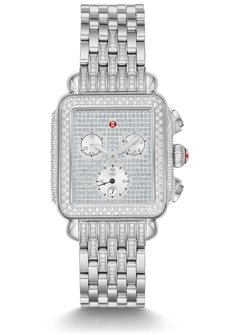 Michele Deco Chronograph Pave Sapphire & Diamond Dial Silve-Tone Bracelet Watch, 33mm x 35mm