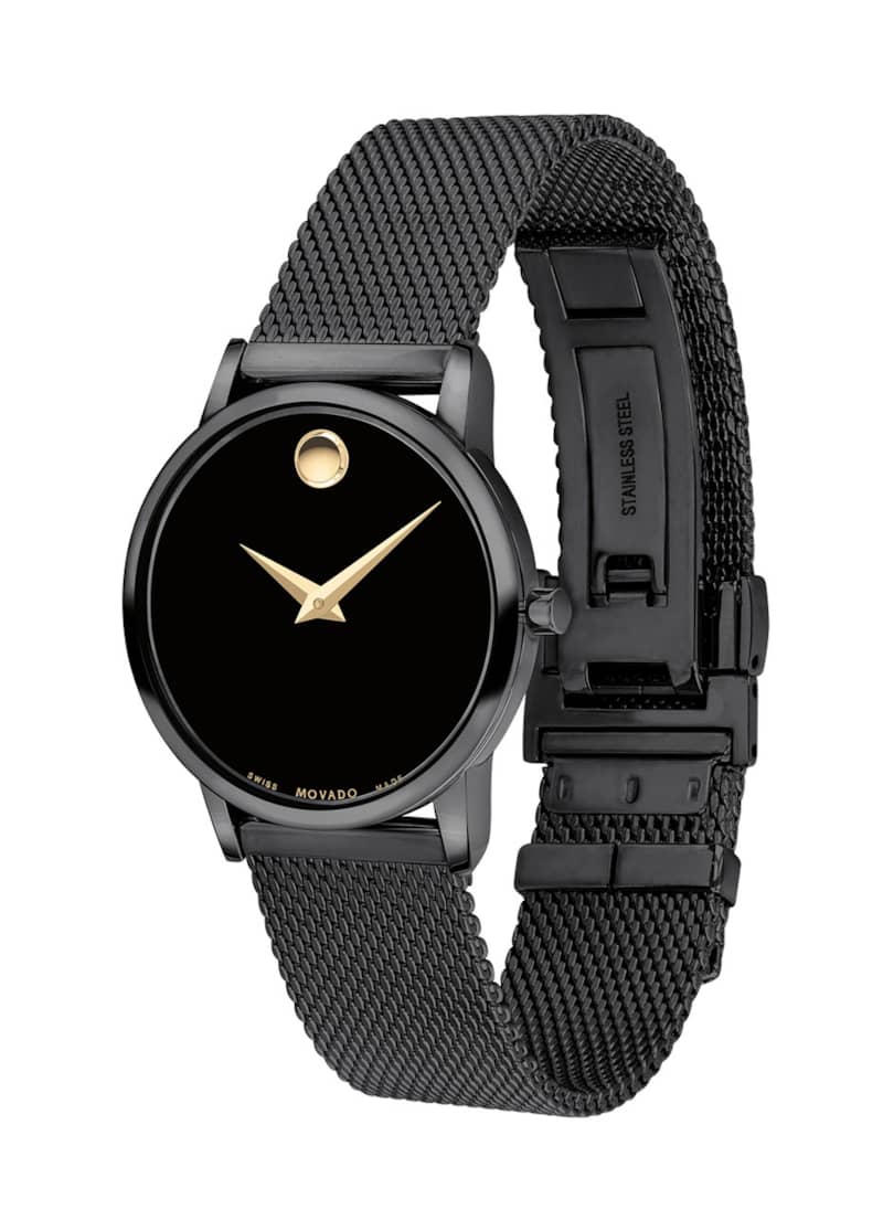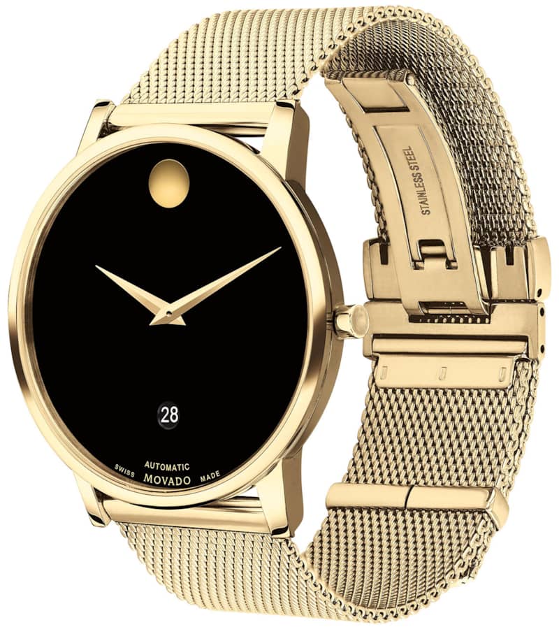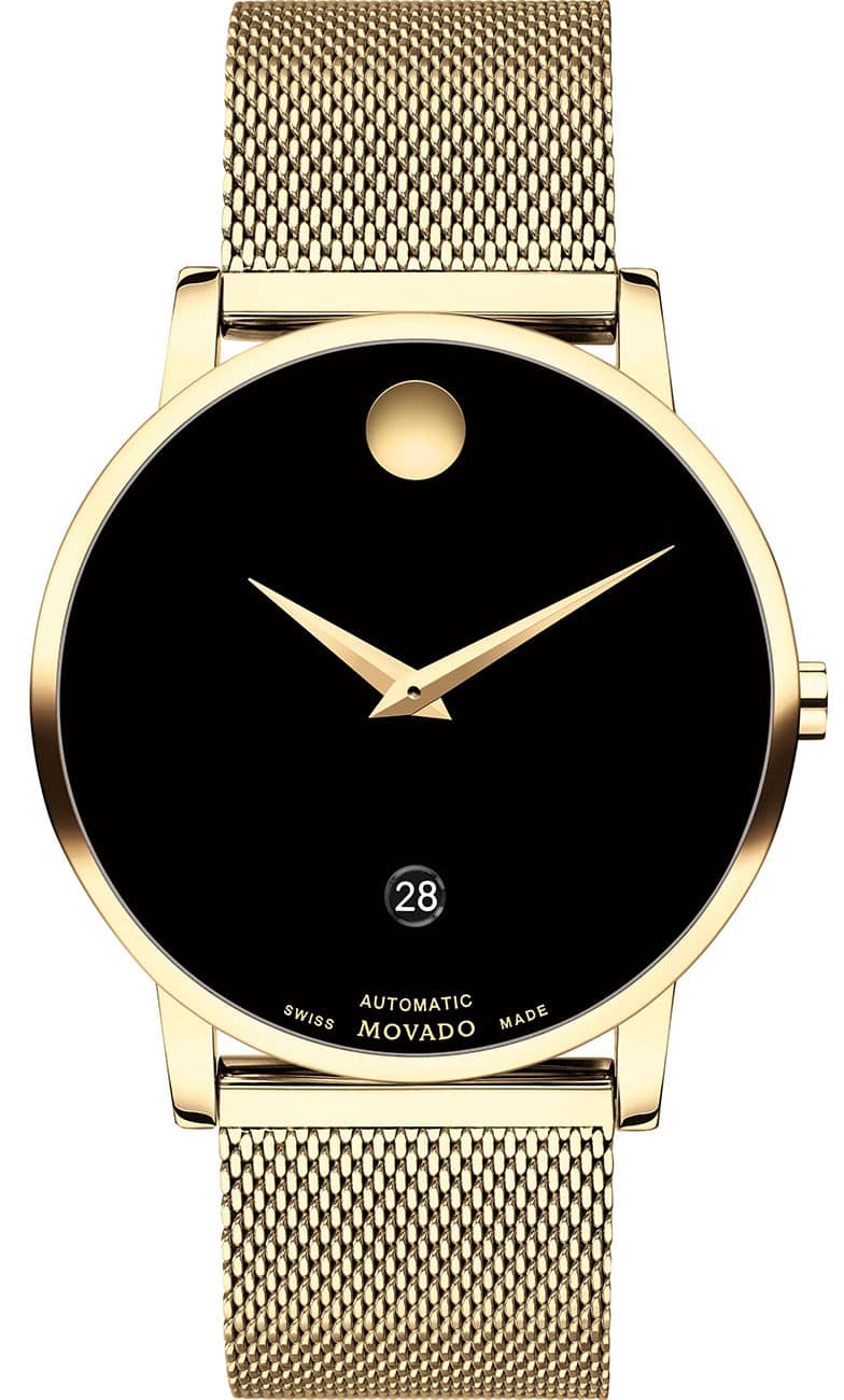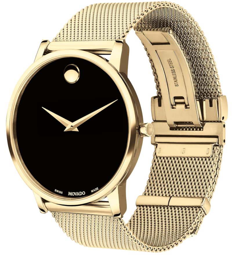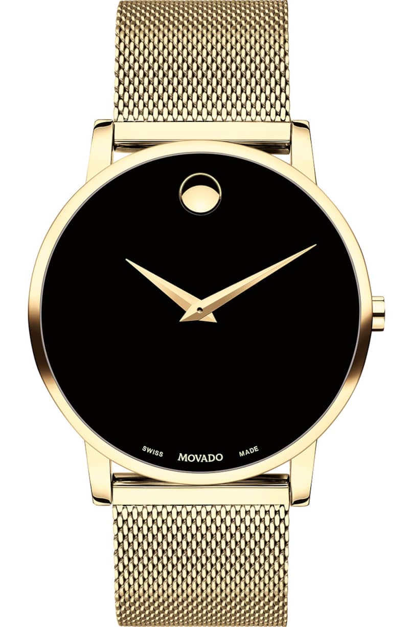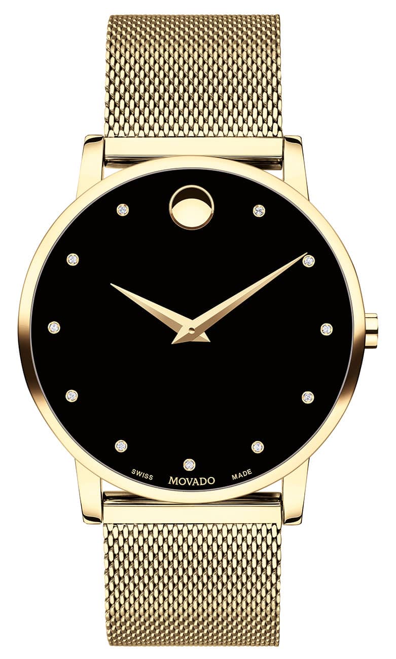 Movado Museum Classic Black Diamond Dial Yellow Gold PVD Stainless Steel Mesh Watch, 40mm