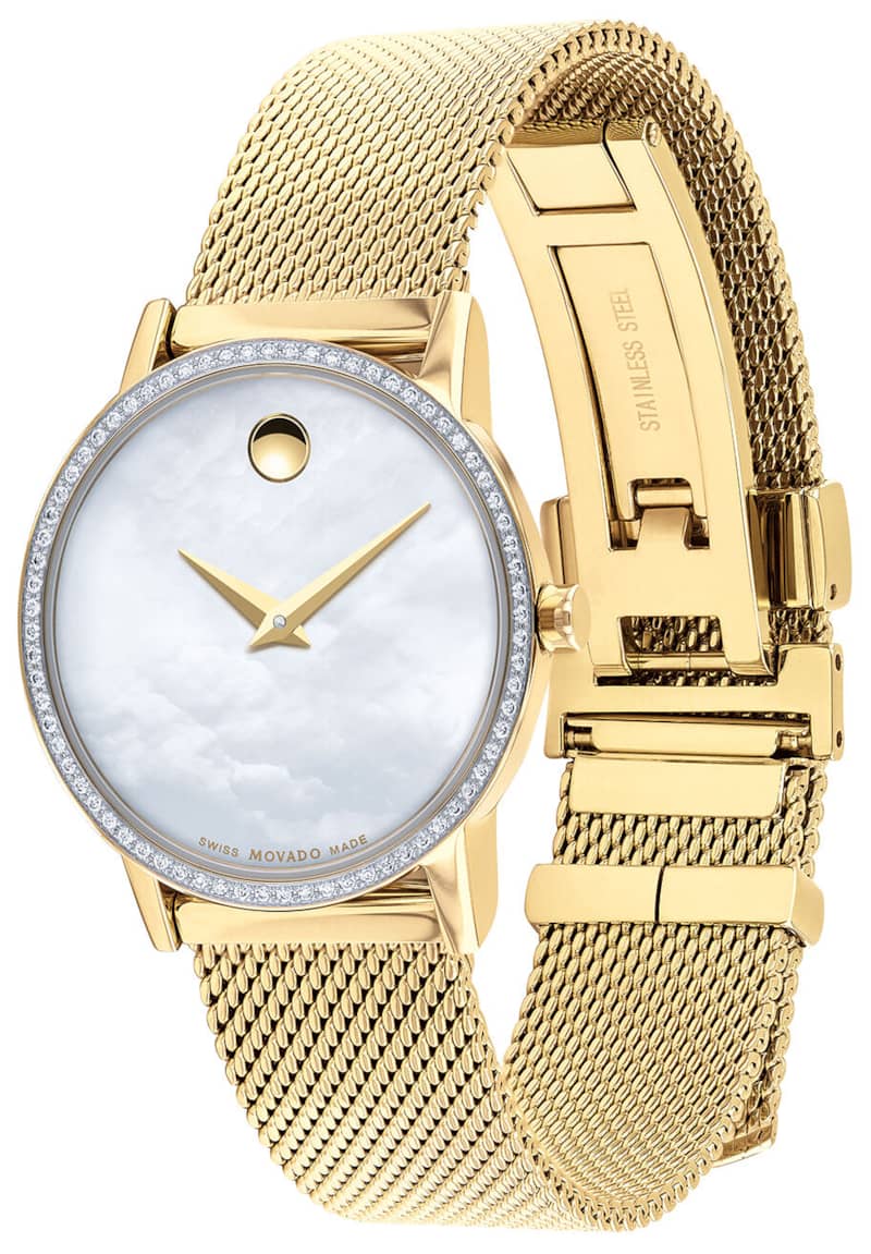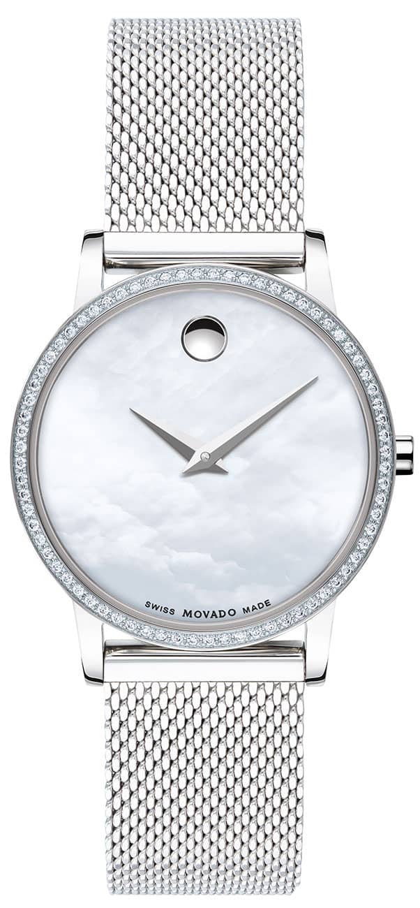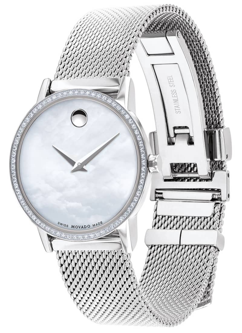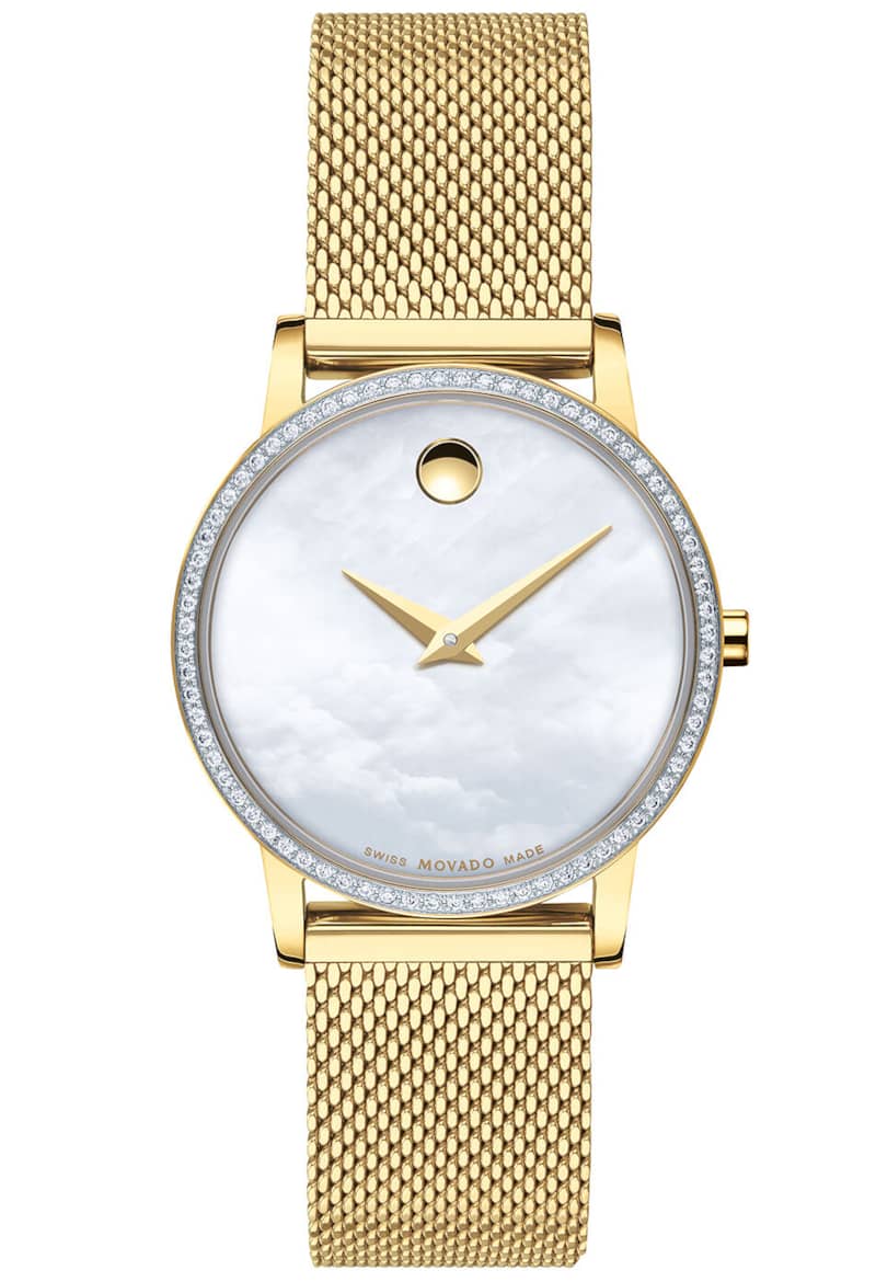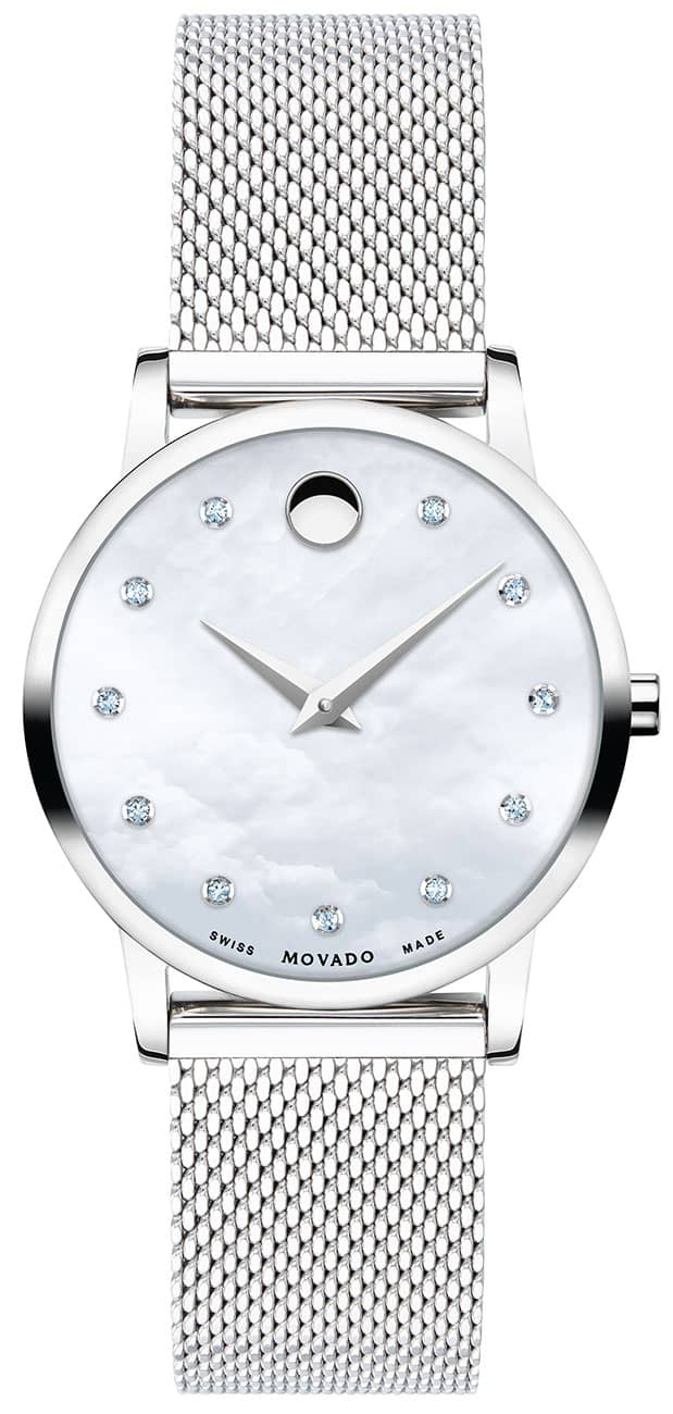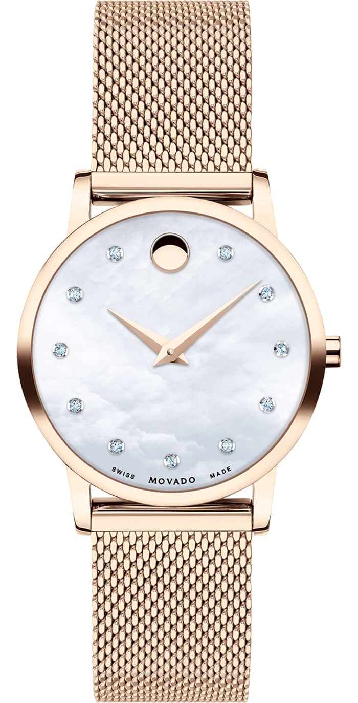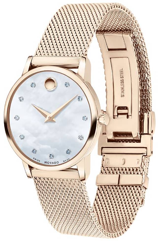 Movado Museum Classic White MOP w/ Diamonds Dial Rose Gold-Tone PVD Mesh Bracelet Watch, 28mm