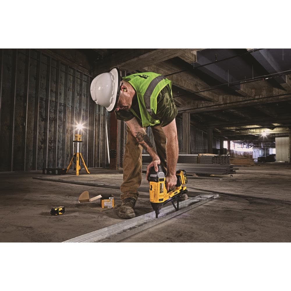 The 20V MAX* XR 1 In. magazine cordless concrete nailer is built for drywall track installation into concrete and steel substrates. This fully electric nailer operates on the same battery as other DEWALT 20V MAX* tools and eliminates the need to purchase fuel cells. A field-serviceable driver blade minimizes downtime. Variable power settings, small-profile 1 In. capacity magazine, and interchangeable nose pieces maximize versatility and convenience. LED LightDrivers make this nailer shine in lowlight conditions. Compatible with DEWALT cordless concrete nailer fasteners in lengths 1/2 In. to 1 In.. compatible with DEWALT cordless concrete nailer fasteners in lengths 1-1/4 In. to 2-1/4 In. when used with DCN8906 2 In. accessory magazine.
