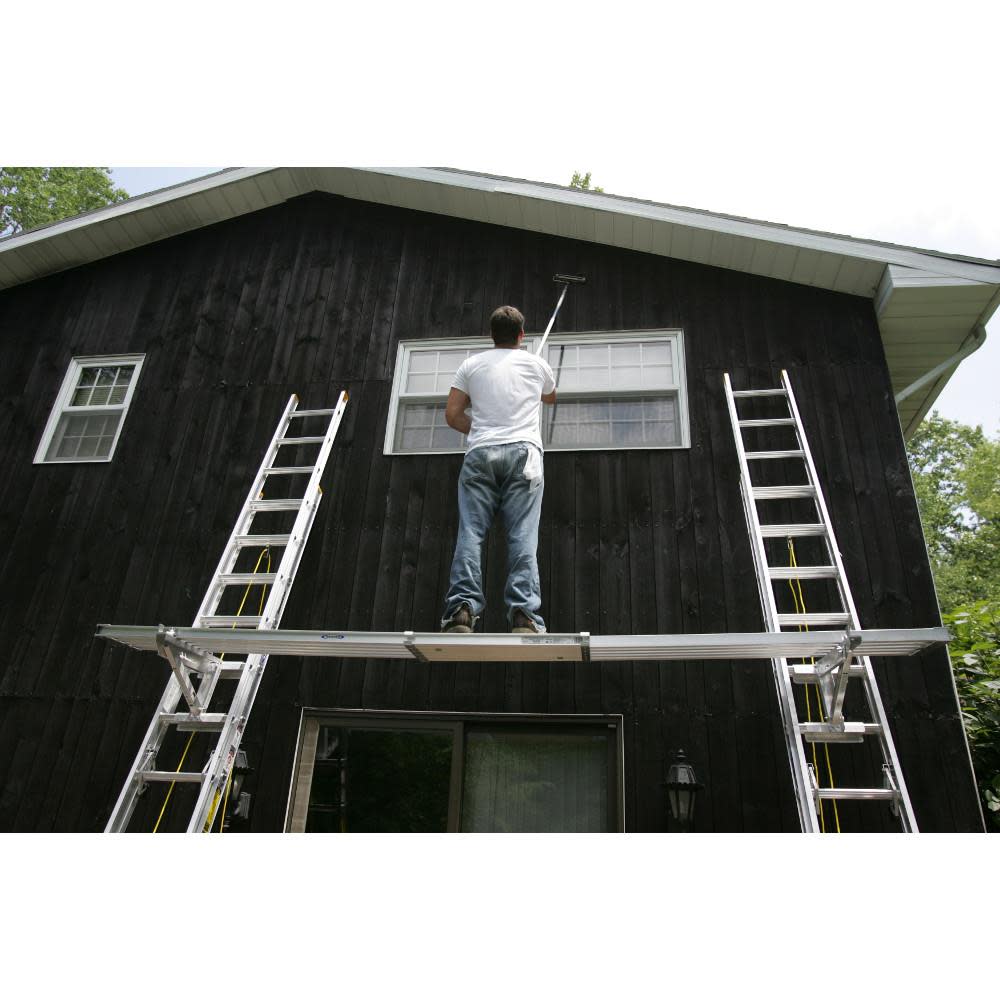 The Werner® 10-foot to 17-foot Aluminum Extension Plank works with a variety of straight extension ladders, single straight ladders, extension trestle ladders, stepladders and telescoping ladders that come equipped with jacks. The plank features positive stops that prevent it from over-extending. The spacer guides on the Werner Aluminum Extension Plank are made from molded thermal plastic to ease opening and closing. It is made from 2-inch, deep box cross-section extrusions and has a heavy flange on its end that acts as a handle for easy operation and rigidity. The outer flange has an open design to accommodate the jack clamps on a ladder. Aluminum rivets hold its extruding cross-members in place by aluminum rivets. The Werner Aluminum Extension Plank’s locking mechanism allows it to extend in 12-inch increments. It has a load-carrying capacity of 250 pounds.