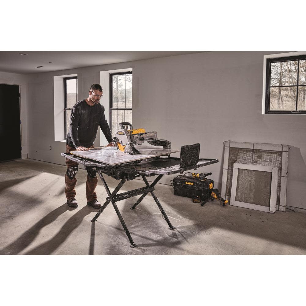 The DeWALT 10 Inch wet tile saw is an ideal tool for any cross-cutting as well as rip-cutting capacity in any jobsite. Saw offers a 37 Inch rip-cutting capacity and a 8-1/2 Inch cross-cutting capacity. Rip cut capacity allows the user to rip any 36 x 36 Inch tile with a 18 Inch cutting clearance and up to 41 Inch with plunge. Cross-cut capacity with a 30% offset facilitates 6 Inch sill cutting as well as up to 8 x 48 Inch plank cutting. Column to cart has a wide enough space of 28-7/8 Inch that passes through 30 Inch door frames. 18 x 36 Inch and 24 x 24 Inch tiles are enclosed in the coverage area when the water tray is installed. Lightweight design of 91 lb makes it easy to carry. Cut-line indicator, robust frame and the strong stainless steel rollers offers great accuracy of up to 1/32 Inch over 30 Inch cuts. Saw is powered by 15 Amp motor that delivers 1220 MWO in the most demanding applications. Storage option is provided to hold the cart extension, miter guide and the wrenches.