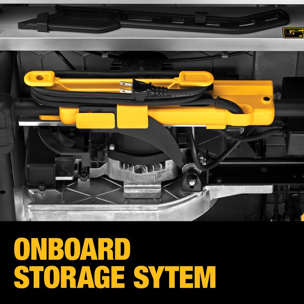 The DeWALT 10 Inch jobsite table saw featured with 32 – 1/2 Inch rip capacity and a rolling stand has a 15 Amp motor for cutting of large and hardwood materials. It assures tool-free guarding component adjustments as well as fast, accurate fence adjustments. Rolling stand of saw is specially designed for quick set up and breakdown with excellent stability. The rack and pinion telescoping fence system ensures fence adjustments fast, smooth and accurate. Telescoping fence rail retract to create a small, portable package. The 32-1/2 Inch rip capacity easily cuts a variety of larger shelving and trim materials. It has patented material support, which can be used for narrow rip cuts. Onboard storage system of tool offers easy access to the blade guard assembly, fence, riving knife, miter gauge, wrenches, push stick and cord wrap when not in use. Table saw features 2-1/2 Inch dust collection port for connecting to a vacuum easily and efficient dust extraction. The 21-7/8 Inch X 26 – 3/8 Inch table provides superior material support. Tool offers 3-1/8 Inch depth-of-cut at 90 degree and 2-1/4 Inch at 45 degree. This tool comes with a 10 Inch 24-tooth carbide blade, rolling stand, push stick, miter gauge, rip fence, blade guard assembly and two blade wrenches.
