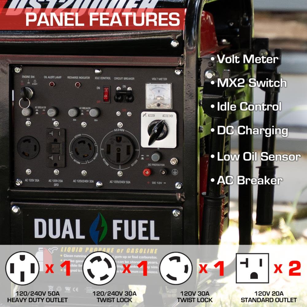 Powerful and versatile, DuroStar’s DS12000EH is ready for anything. Perfect for home backup, the Dual Fuel option doubles fuel life when running propane, making this unit an effective, low-maintenance solution for your home standby needs. Producing over 12,000 watts you can rest assured you will stay powered through any storm. You can also easily transport this unit to the job or camp site. This Dual Fuel generator runs on either gasoline or propane, which provides the freedom and flexibility of fuel choice. While gasoline is a tried and true fuel option, liquid propane lasts longer, costs less, has a longer storage life and won’t gum up or damage the carburetor. The DS12000EH features a user-friendly, keyed electric start, and is also equipped with an optional recoil start. This powerhouse generator is powered by a 457cc OHV Engine that feeds the fully loaded power panel allowing the user to pull up to the maximum 12,000 watts of power. The panel includes two 120V/20AMP outlets, one 120v/30AMP twist lock outlet, a 120/240V 30AMP outlet, and a 50-amp heavy duty outlet to power the most demanding needs. The panel also features a volt meter, circuit breakers, low oil indicator, idle control, and unique MX2 switch, which doubles your 120-volt amperage for heavy loads. With it you can get maximum power from each 120-volt receptacle and have the option of operating at both 120 and 240 volts simultaneously. The units heavy-duty all-metal frame has fully-isolated motor mounts, and an oversized noise reducing muffler with a built-in spark arrestor allowing for smooth and quiet operation. The DS12000EH is easy to transport over any terrain with the included handle kit and runs on rugged and durable solid-fill tires. Like all DuroStar generators, this unit is built with all copper windings, that will last for years, and is covered by a 3-year factory warranty.