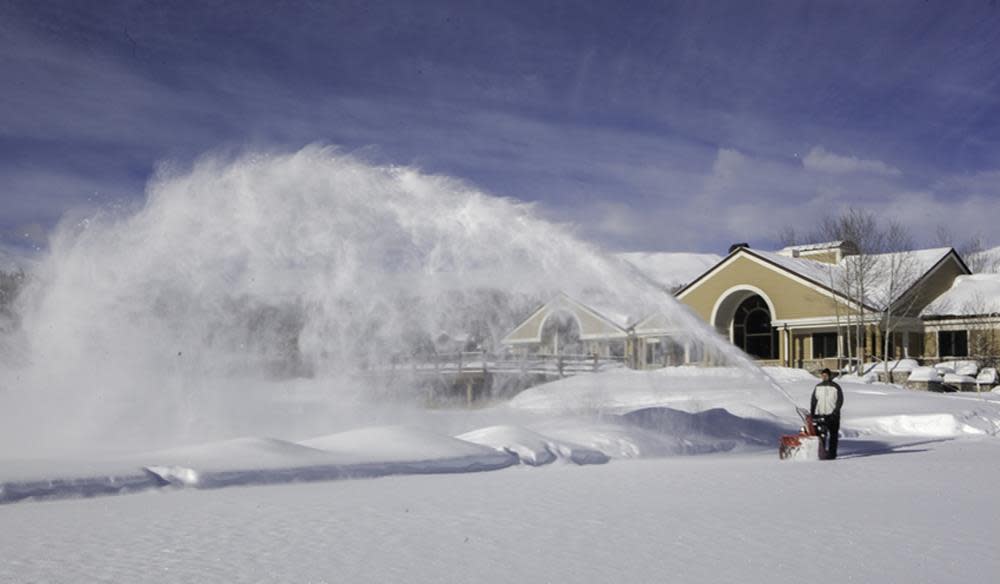 Two-stage snow blowers use a fast spinning impeller in the discharge duct to throw snow faster and farther