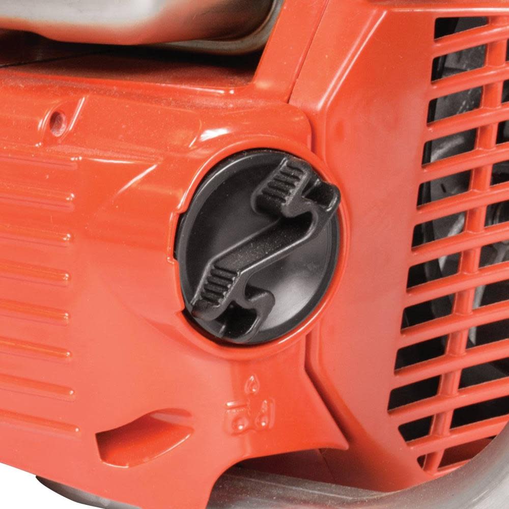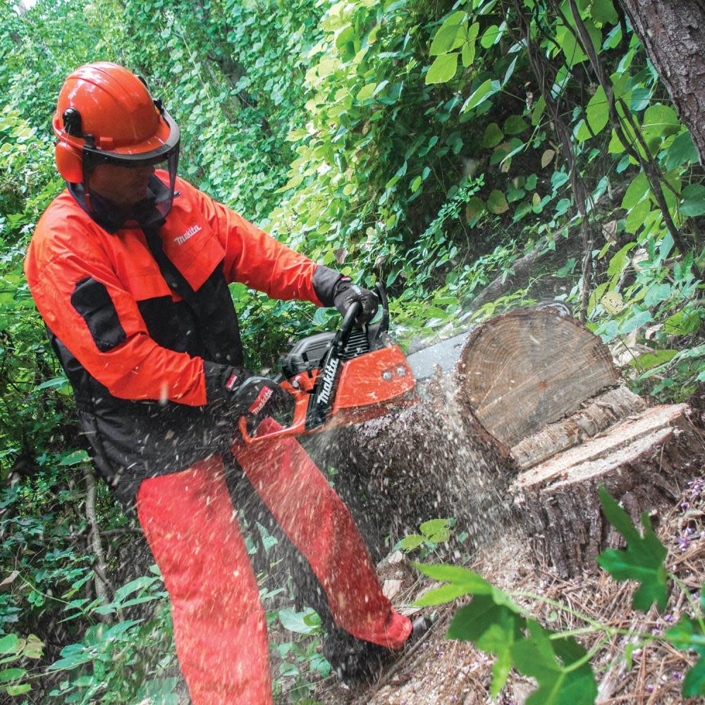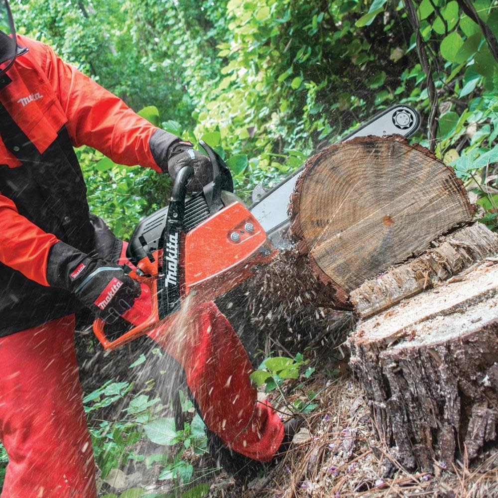 The Makita 18 Inch chainsaw is powered by a 61 cc engine that delivers a power rating of 4.6 HP and an operating speed of 13,800 RPM. Spring-assisted starter makes it easy to start the tool with minimal force. High power-to-weight ratio ensures a noiseless operation making it ideal for a wide range of applications. Single lever with touch and stop controlling ceases the engine with just a touch. Compact and lightweight profile makes it easy to use and carry. Chain compartment is easy to clean and helps in clearing chips efficiently. Vibration dampening system minimizes vibration for user comfort. The option of slide-out baffle configuration helps in easy cold weather operation. Two-point chain brake provides both inertia and mechanical control. Lateral chain tensioning makes it easy to adjust the chain. Stratified air scavenging engine emits less carbon and increases the fuel efficiency. Cartridge air filter system enhances the filter life and is ideal for heavy-duty use. Strong magnesium construction offers added strength and durability. Floating rim sprocket helps in easy to maintain and increase the chain life. Chainsaw comes with a guide bar and a chain cover.