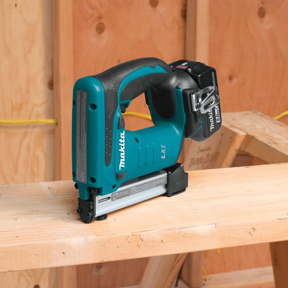 The Makita 18 Volt LXT® cordless crown stapler kit contains XTS01Z 18 Volt LXT® 3/8 Inch crown stapler, two BL1850B 18 Volt LXT® Lithium-Ion 5 Amp-hour batteries, DC18RC 18 Volt LXT® Lithium-Ion rapid optimum charger, tool bag. Stapler features Makita built motor that delivers power to fasten a wide range of 3/8 to 7/8 Inch crown staples. Tool with spring-loaded driving mechanism, has a convenient window that allows user to see the number of remaining staples. It has rugged machined aluminum magazine that assures smooth loading and feeding of staples. Adjust the depth control setting easily by turning single knob. Tool powered by an 18 Volt Lithium-Ion slide style battery assures fastest charge time, more working time and minimal sitting time on the charger. Contact actuation is perfect for production environment. This stapler with battery, weighs only 5.1 lb and has rubberized soft grip handle that reduces user fatigue and provides increased comfort on the job. Tool featured with Star Protection Computer Controls™, allows the Star Protection-equipped tool and battery to exchange data in real time. This Star Protection communication technology also monitors condition while in use to safeguard against overloading, over discharging and overheating.