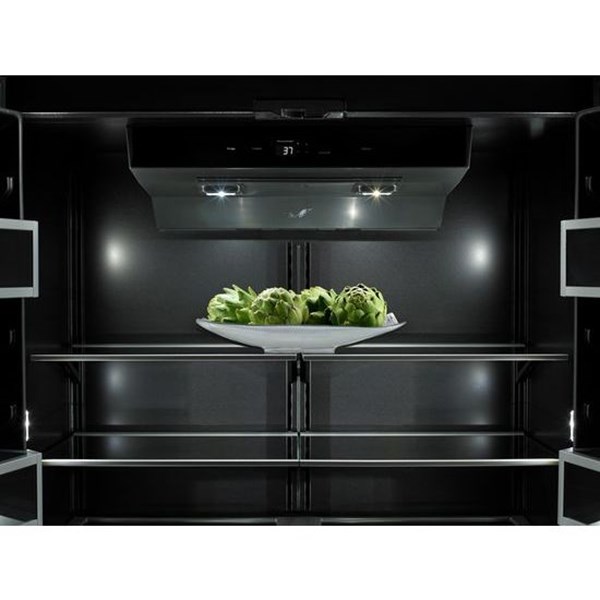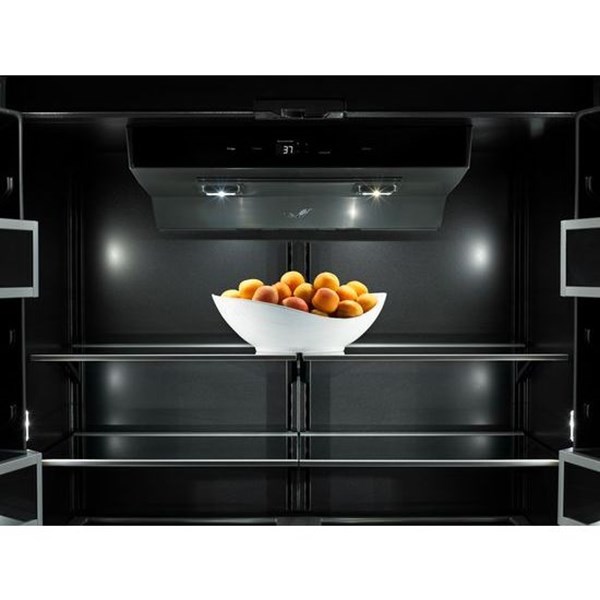 - Multi-Point LED Theater Lighting – Multiple LED lights increases visibility and beautifully showcases food items against the Obsidian interior, on both Elegance Shelving and inside refrigerator and freezer drawers.