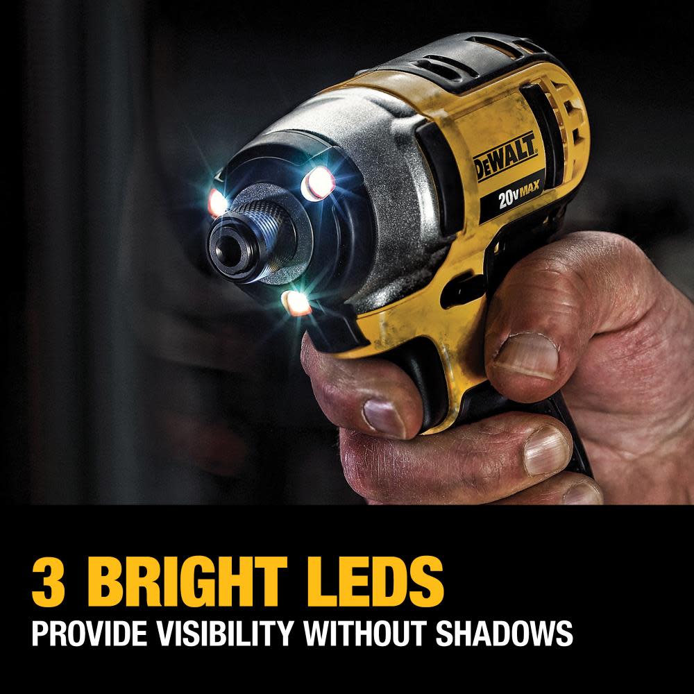 DCF885 20-volt MAX cordless impact driver has 3 LED lights with a 20-second delay after trigger release, providing visibility without shadows