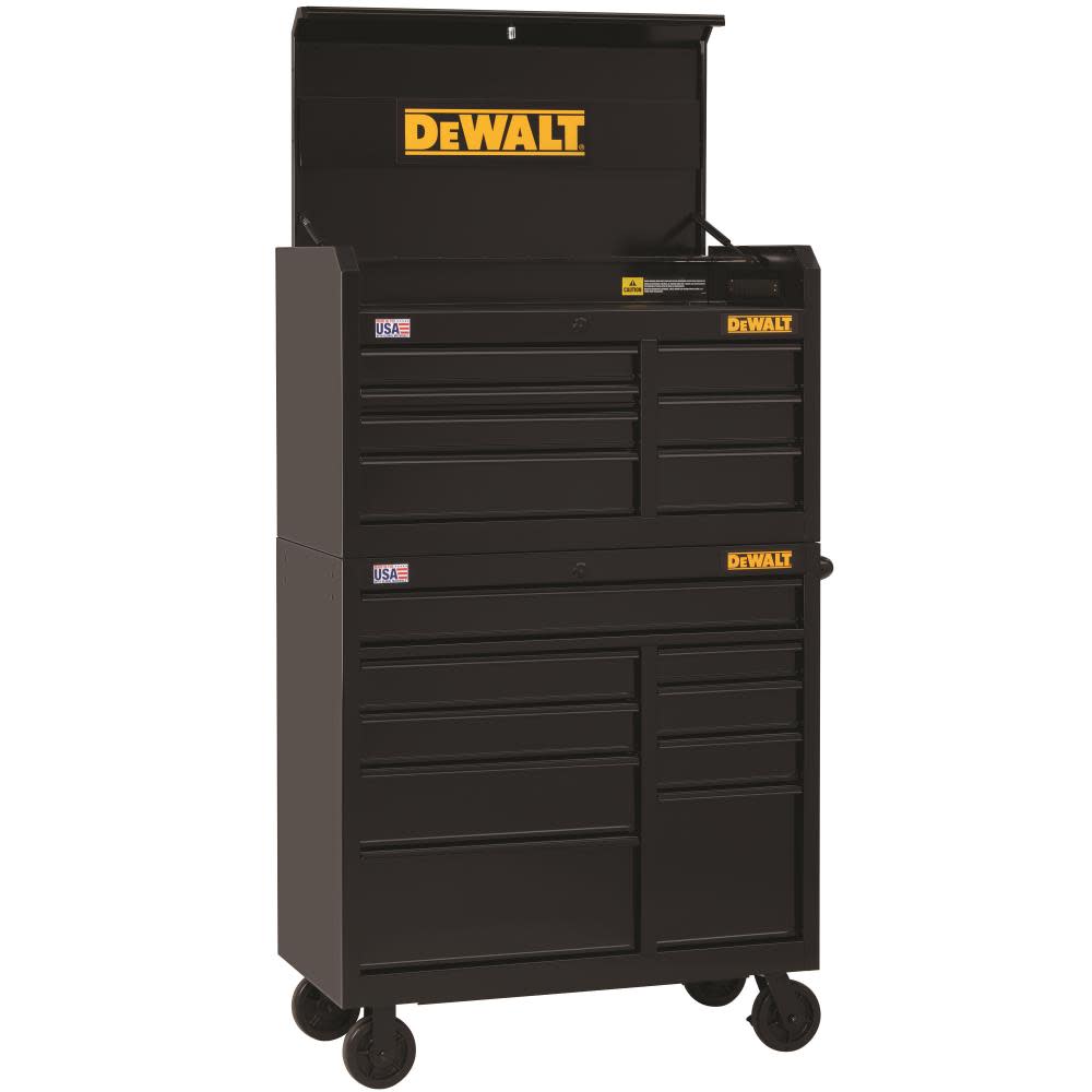 This 900 Series 41-inch wide 7-Drawer Tool Chest is constructed of double-wall steel for strength and durability. It has seven drawers with a 200-pound load capacity. The full-extension ball-bearing drawer slides are equipped with the POSI-LATCH drawer latching system for easy release by lifting the drawer trim. It also has a heavy-duty keyed internal locking system to safeguard tools. Conveniently charge your power tools, batteries, and electronics in the under-lid area with gas struts for easy opening and closing. Also included are seven DEWALT embossed drawer liners and one DEWALT embossed top mat. Recommended with this unit is our 900 Series 41-inch wide 9-Drawer Rolling Tool Cabinet (DWST24191), sold separately.