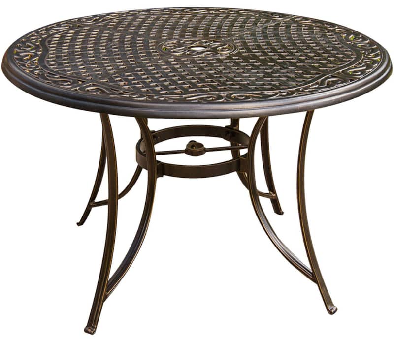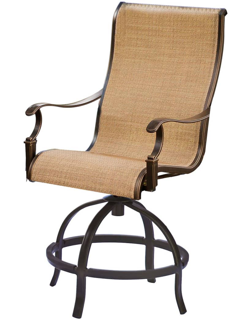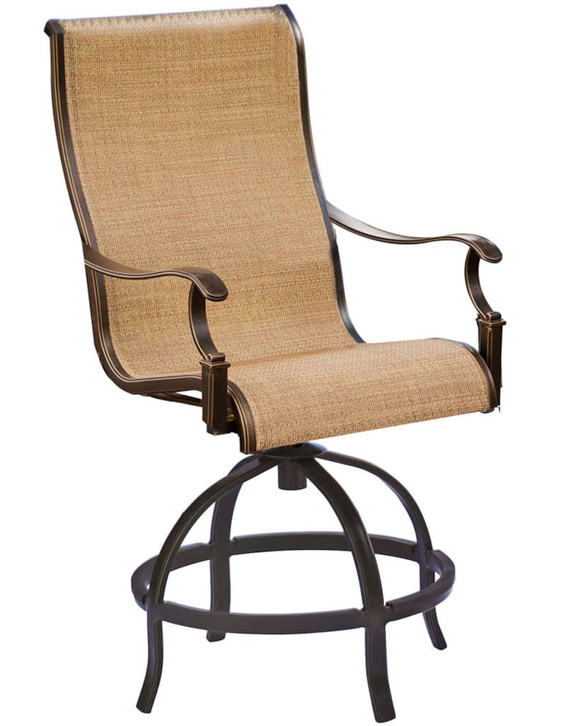 Hanover Manor 7-Piece Outdoor Dining Set In Tan Sling/Cast With 6 Sling Counter Height Swivel Chairs, 56″ Round Cast Table