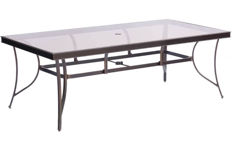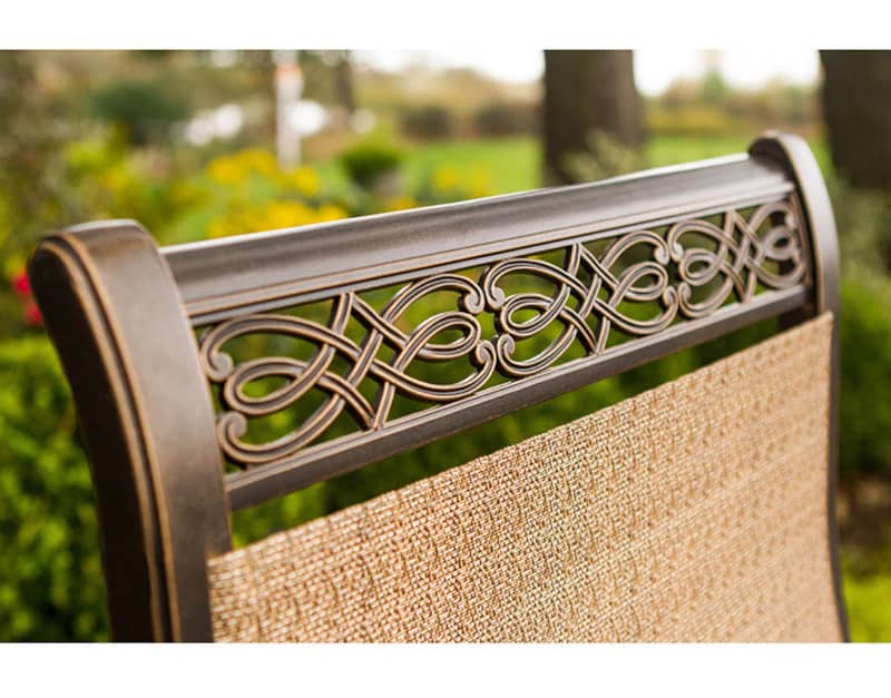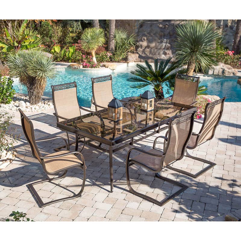 Hanover Monaco 7-Piece Outdoor Dining Set In Tan/Bronze With 6 Spring Sling Chairs, 42″ x 84″ Glass-Top Table