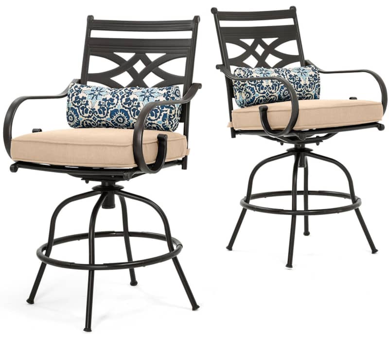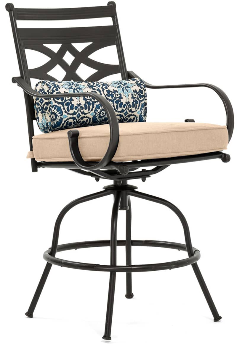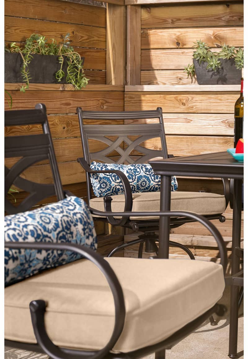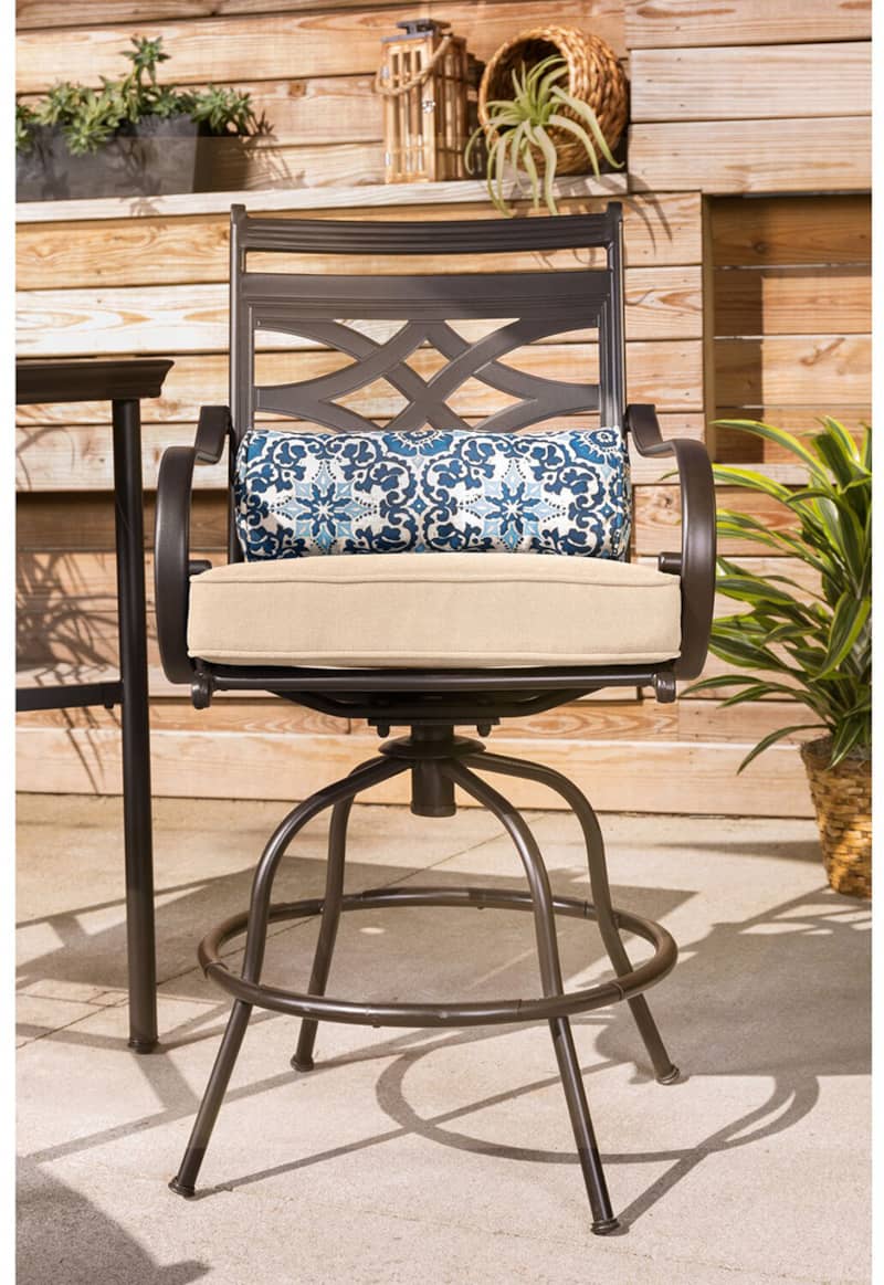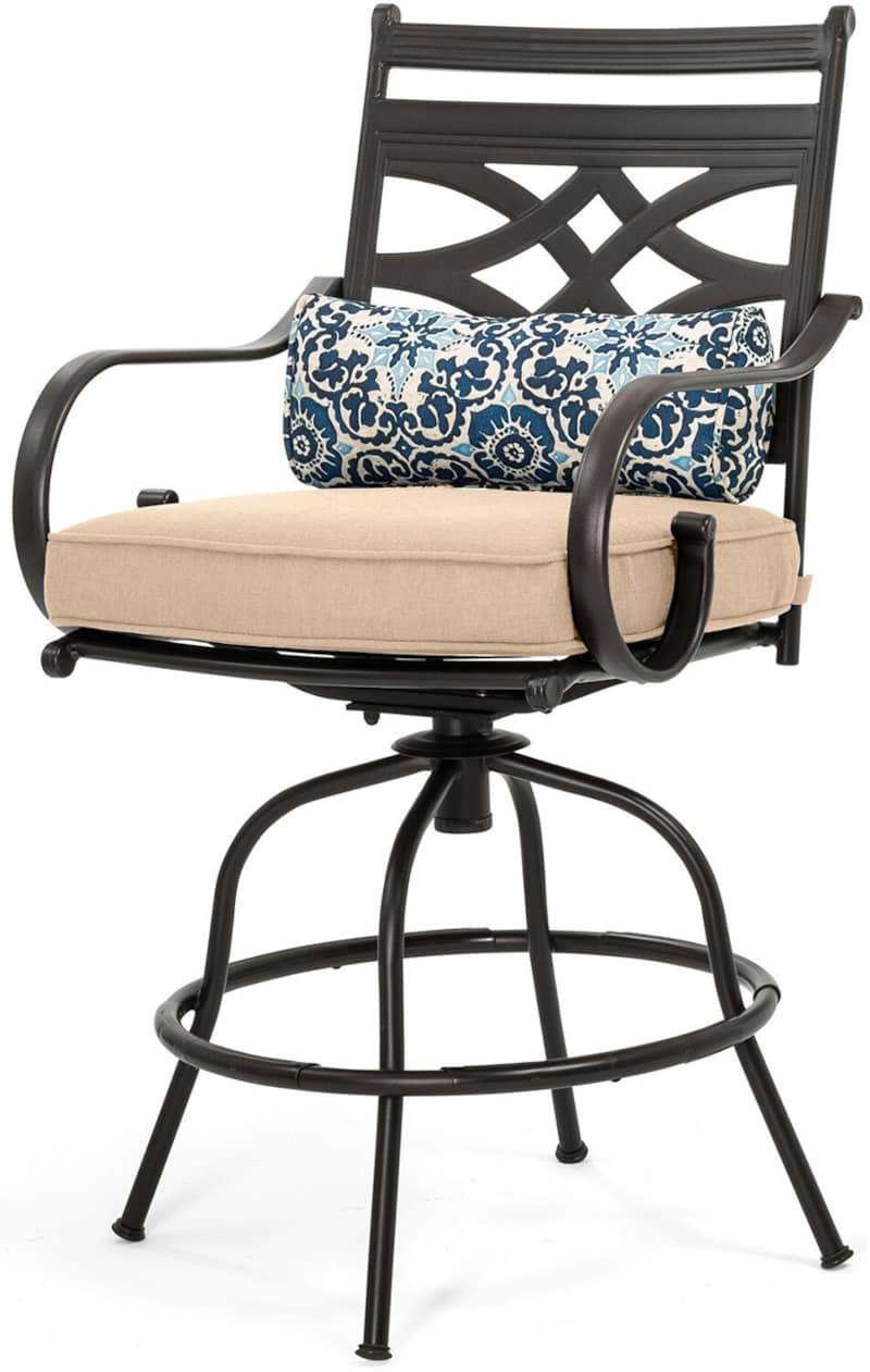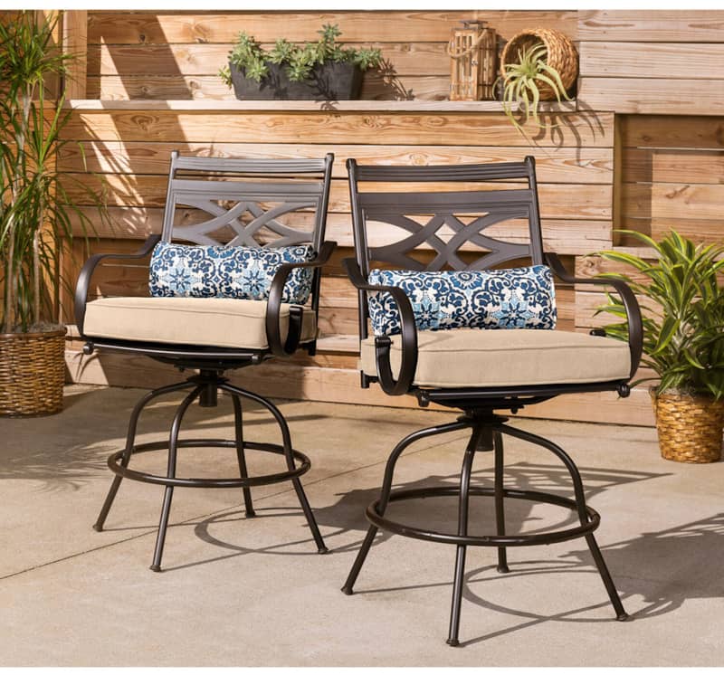 Hanover MCLRDN5PCBRTAN Montclair 5-Piece Outdoor High Dining Set In Tan/Brown With 4 Swivel Chairs, 33″ Square High Dining TableSpend more time outdoors with the Montclair 5-piece high-dining patio set from Hanover. This space-friendly dining set includes four swivel chairs and a 33-inch square dining table. The sleek, modern frames are forged out of heavy-duty steel and treated with a multi-step finish for the ultimate outdoor protection. Items within the Montclair Collection are designed to be durable, functional, and timeless. Designer details include curved backrests, elegant curling arms, and swivel-action chair bases that can sweep guests off their feet into a full 360-degree spin. Each chair is topped with thick foam cushions and pillows that allow you to entertain your guests in fashionable comfort. The fabric is soft to the touch, yet durable enough to resist moisture, stains, and UV harm. Entertain in style and comfort all year long with the Montclair Collection. Features
