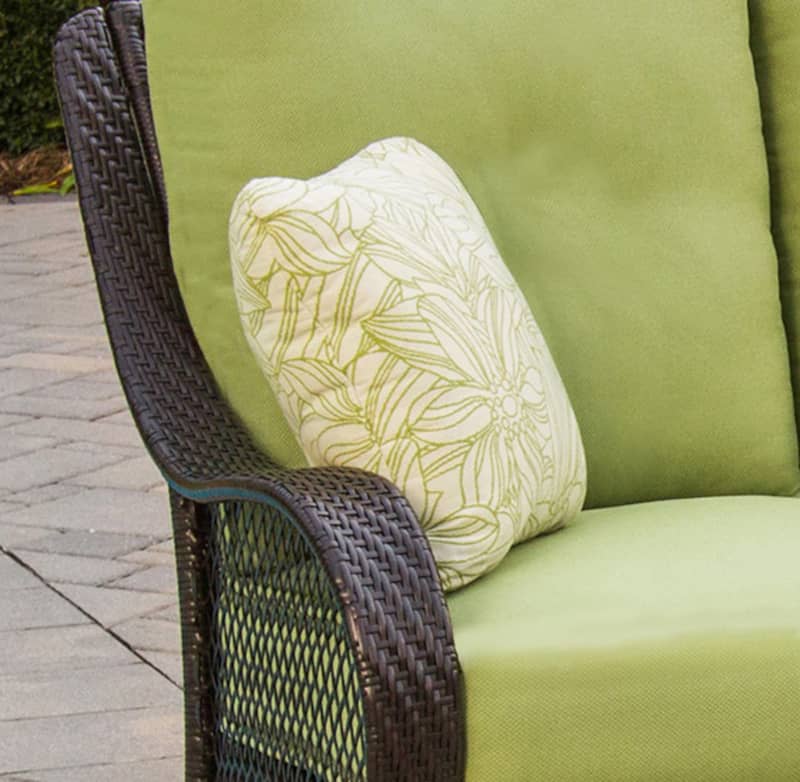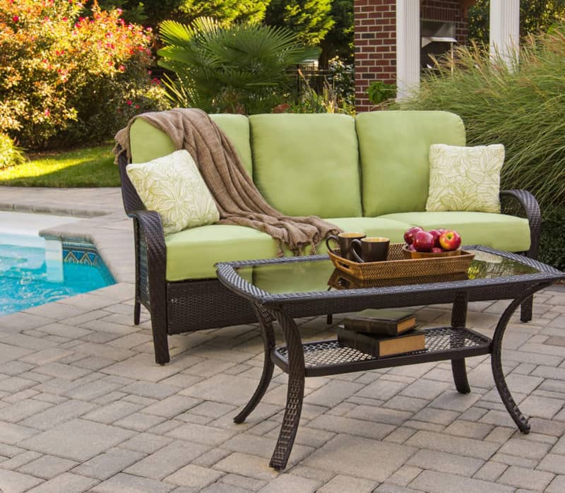 Hanover Orleans 2-Piece Avocado Green Outdoor Seating Patio Set, Model ORLEANS2PCRelax in casual style and comfort with the Orleans 2-Piece Patio Set from Hanover Outdoor. This trendy set includes one all-weather, deep-seating sofa, two coordinating toss pillows and a glass-top coffee table perfect for smaller areas like porches, gardens or patios. Spacious enough to comfortably seat three adults, this outdoor set consists of heavy-duty, rust-resistant steel frames beneath an all-weather resin weave. This sophisticated construction is treated to withstand the toughest weather conditions and lasts much longer than traditional wicker. The coffee table features a tempered-glass top and includes a lower shelf for additional storage. The plush back and seat cushions are made with extra-thick layers of foam that will cradle you and your guests in complete comfort. The entire set requires little maintenance, is easy to assemble and designed for many years of outdoor enjoyment. Features