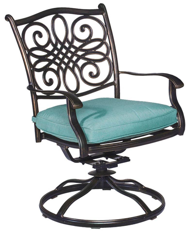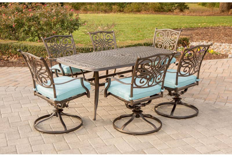 Hanover TRADDN7PCSW6-BLU Traditions 7-Piece Dining Set In Blue With 72″ x 38″ Cast-Top TableTurn to the Traditions 7-piece dining set for the most comfortable outdoor dining from Hanover. Six swivel action chairs provide a smooth 360-degree spin and gentle rocking motion as you entertain your guests around the extra long cast-top dining table. Elegant cast accents scroll across the chairs and table top and add a level of sophistication and craftsmanship to the collection. Six foam seat cushions are included for each chair, offering additional comfort to your family and guests. Enjoy the peace-of-mind knowing the materials are treated to resist weather, rust and UV fading throughout the years, making this a quality dining set to have as the centerpiece of your backyard or patio. Features