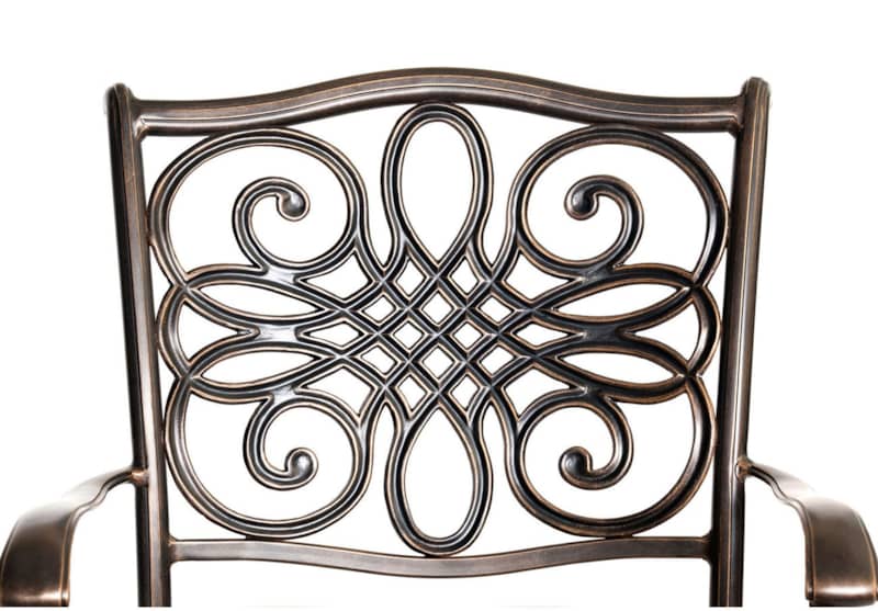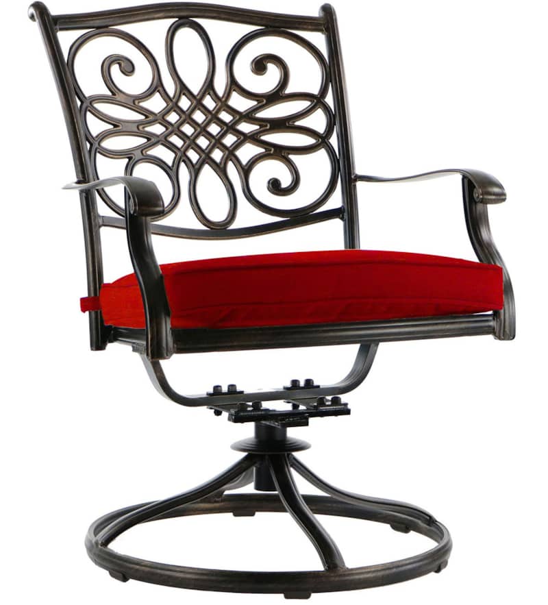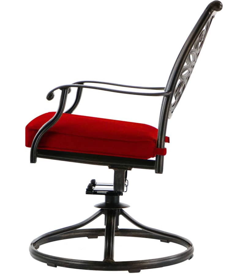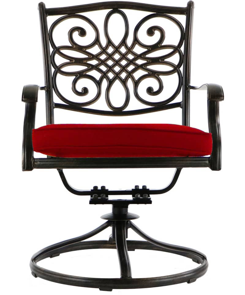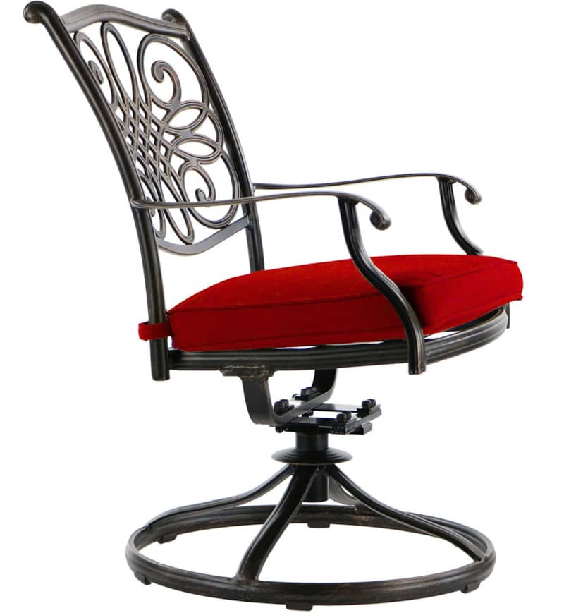 Hanover TRADDN7PCSWRD6-RED Traditions 7-Piece Outdoor Dining Set In Red/Cast With 6 Swivel Rockers, 60″ Round Cast TableTurn to the Traditions 7-piece dining set for the most comfortable outdoor dining from Hanover. Six swivel action chairs provide a smooth 360-degree spin and gentle rocking motion as you entertain your guests around the 60-inch round dining table. Elegant cast accents scroll across the chairs and table top, adding a level of sophistication and craftsmanship to the collection. Six foam seat cushions are included for each chair, offering additional comfort to your family and guests. Enjoy the peace-of-mind knowing the materials are treated to resist weather, rust and UV fading throughout the years, making this a quality dining set to have as the centerpiece of your backyard or patio. Features