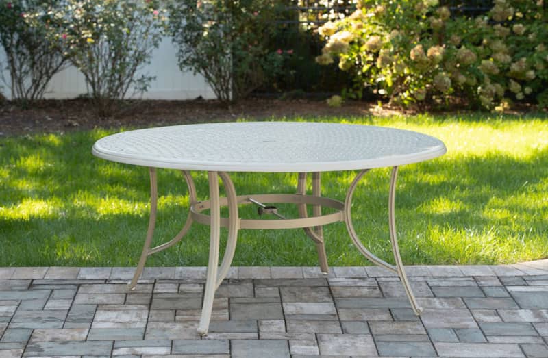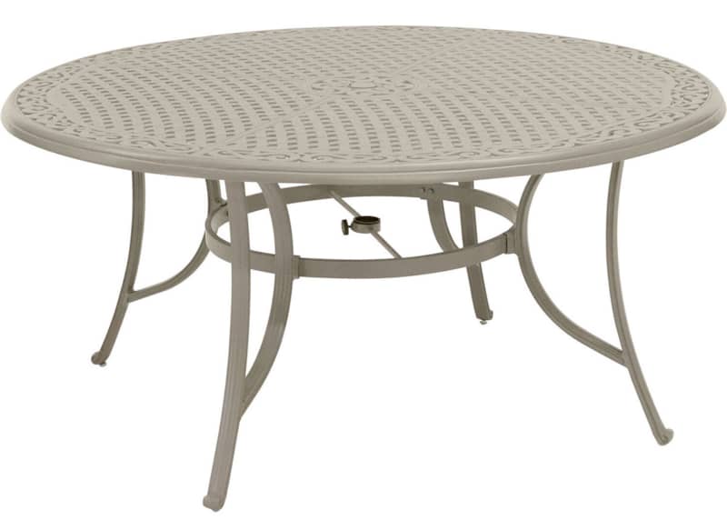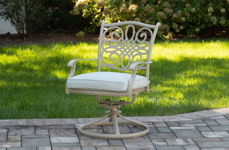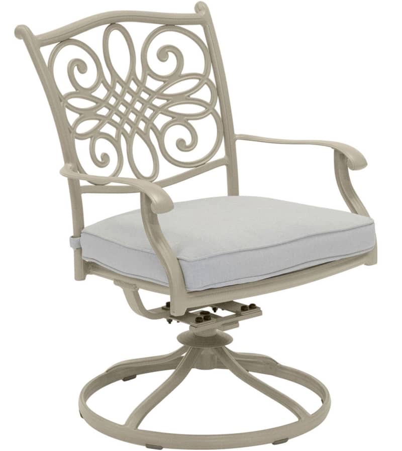 Hanover Traditions 7-Piece Outdoor Dining Set In Sand/Beige With 6 Swivel Rockers, 60″ Round Cast Table