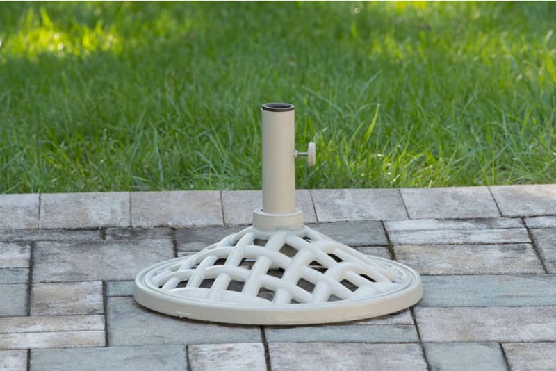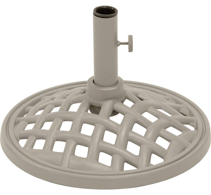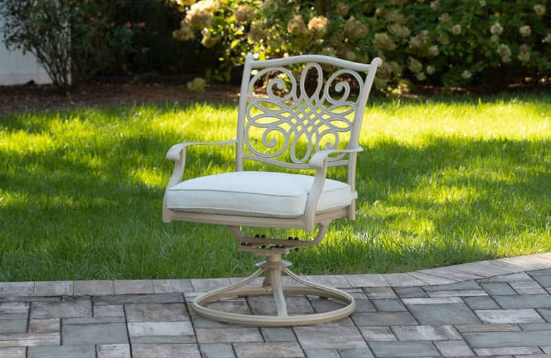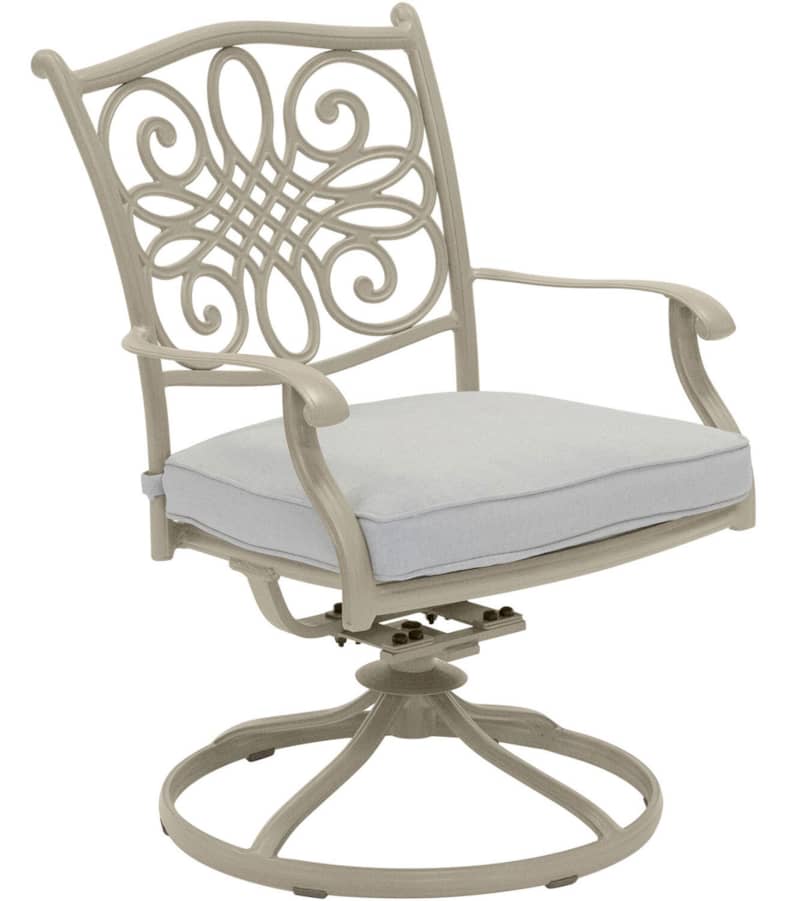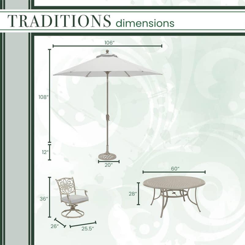 Hanover Traditions 7-Piece Outdoor Dining Set In Sand/Beige With 6 Swivel Rockers, 60″ Round Cast Table, Umbrella, Base