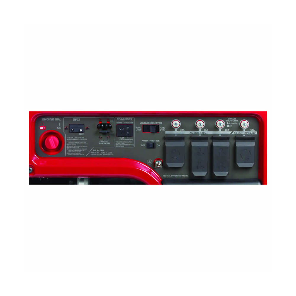 The Honda 6500W industrial series generator delivers outstanding power and operating efficiency. This generator features Honda’s computer-controlled iGX engine, providing easy-start electronic ignition and efficient fuel release. The Honda 6500W generator has a 6.2 Gal fuel tank, allowing 10.4 Hr of operating time at half load and 6.9 Hr at its full load of 6500W. The generator is equipped with Honda Oil Alert® technology to shut down the engine when oil pressure is too low. Innovative intelligent automatic voltage regulation technology stabilizes RPM according to load and provides 7000W at 10 Sec intervals to power up high-load tools. The Honda industrial generator is enclosed in a welded, portable frame with large wheels and handlebars that lock in place. It also has a hanger support and ring for storage. The portable industrial generator has 6 outlets, all GFCI protected. A low decibel rating makes it ideal for use in neighborhoods with noise restrictions. Honda 120/240V, 389cc, 6500W, Non-Carb Complaint Gasoline Industrial Generator.
