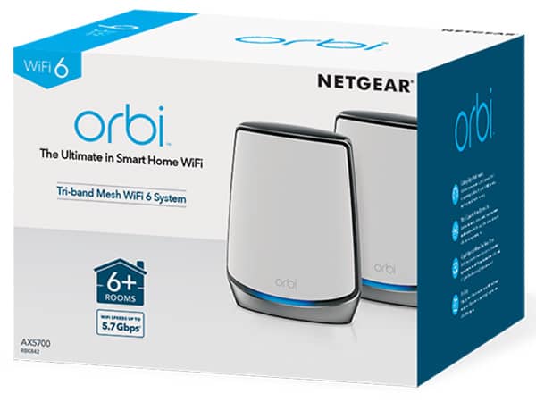 Netgear RBK852100NAS Orbi Tri-Band WiFi 6 Mesh System 2 PackCover up to 5,000 sq. ft. with blazing-fast, reliable WiFi with speeds of up to 6Gbps for over 100 devices. Stream, browse, and work uninterrupted in every room of your home. Key Features