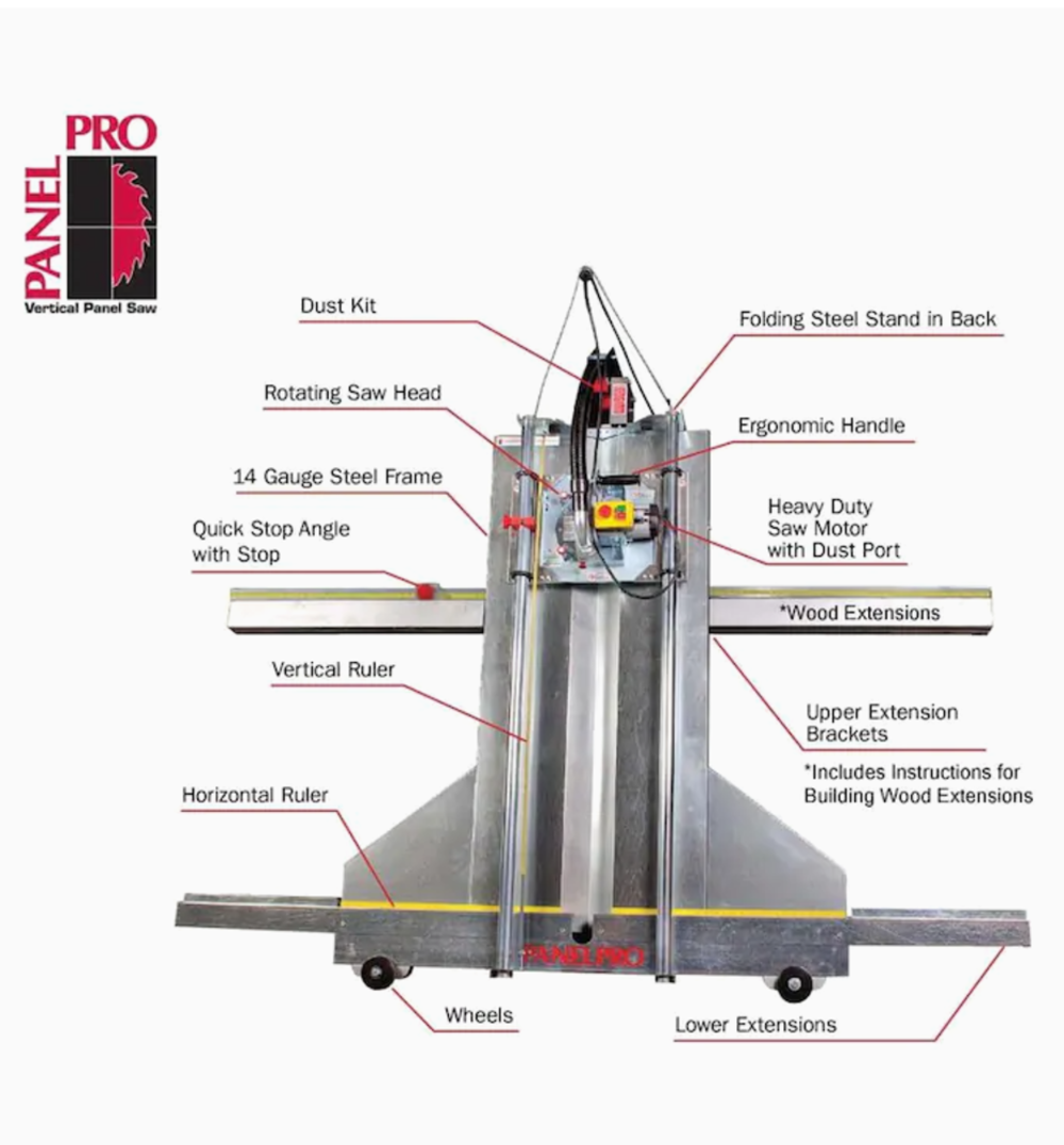 The Panel Pro Deluxe is designed to efficiently cut 4-ft x 8-ft sheets of material at the construction site, shop, garage, or wherever you may use it. It has a quick rotating saw head that allows for both horizontal and vertical cuts of a wide variety of material up to 1.5-in thick. The Panel saw is a lightweight saw that has a folding stand, wheels, and easy on/off frame extensions to make this machine portable and versatile. It also requires minimal assembly upon arrival and with its vertical design it takes up less space.