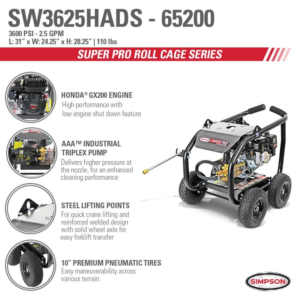 Simpson SuperPro Roll Cage Cold Water Professional Gas Pressure Washer 3600 PSI