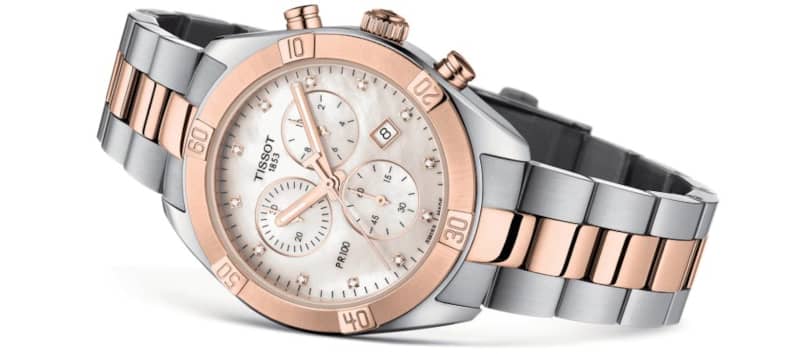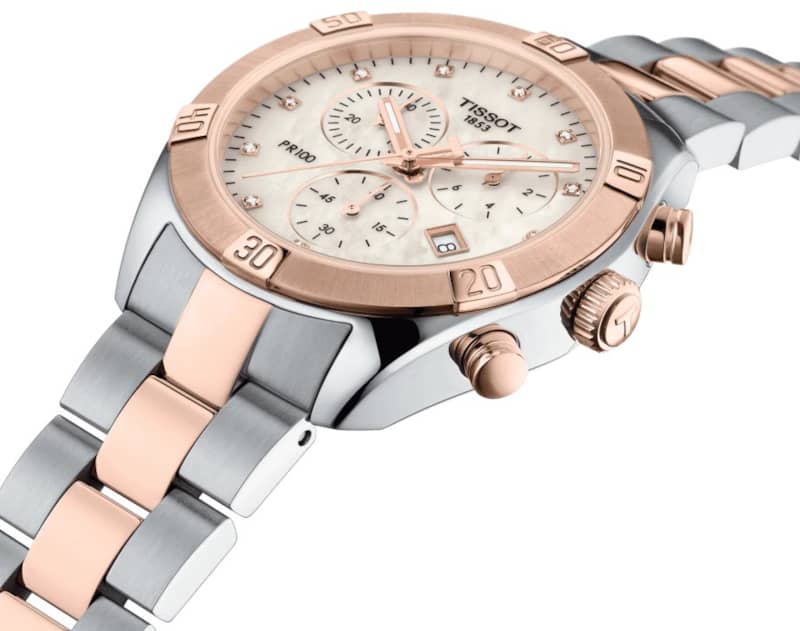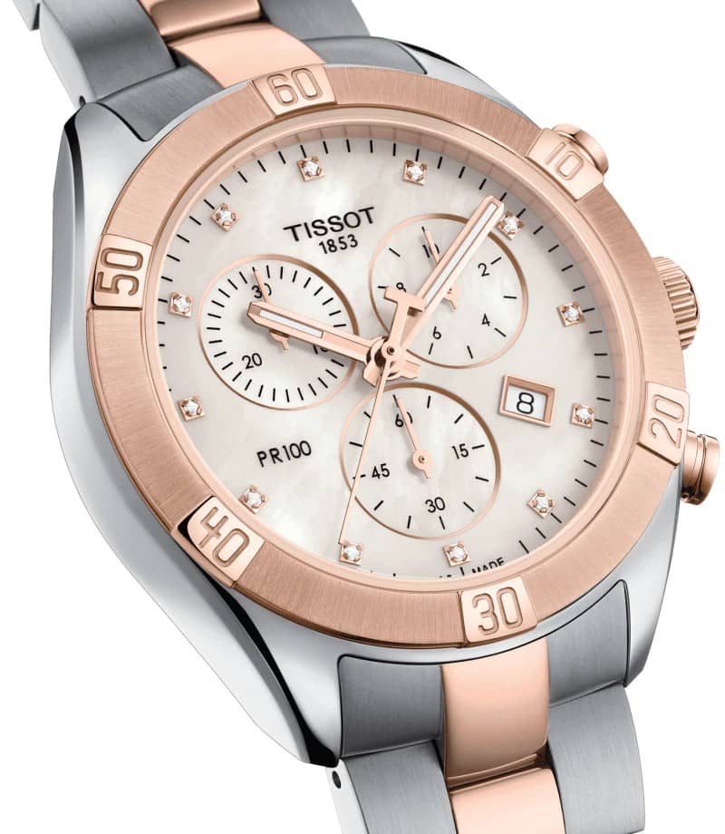 Tissot PR 100 Sport Chic Chronograph White MOP Dial w/ Diamonds Two-Tone Carnation Gold Bracelet Watch, 38mm