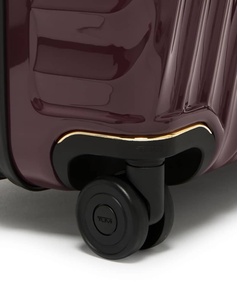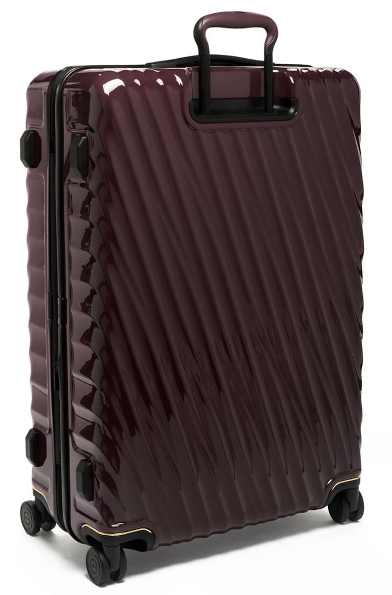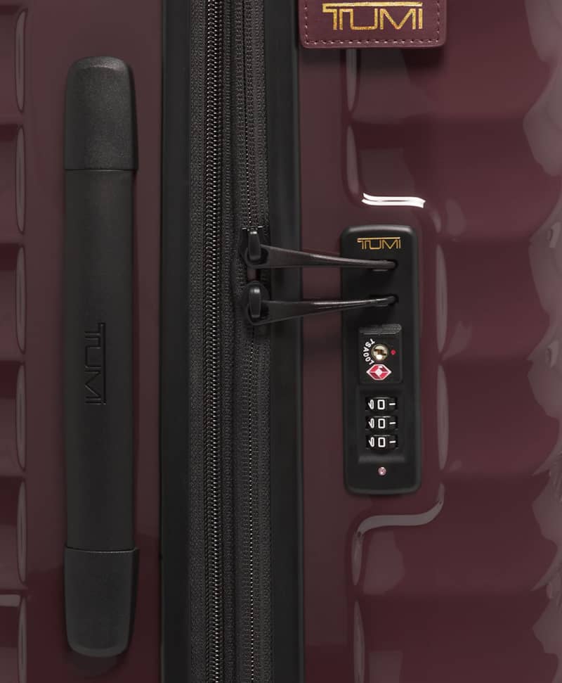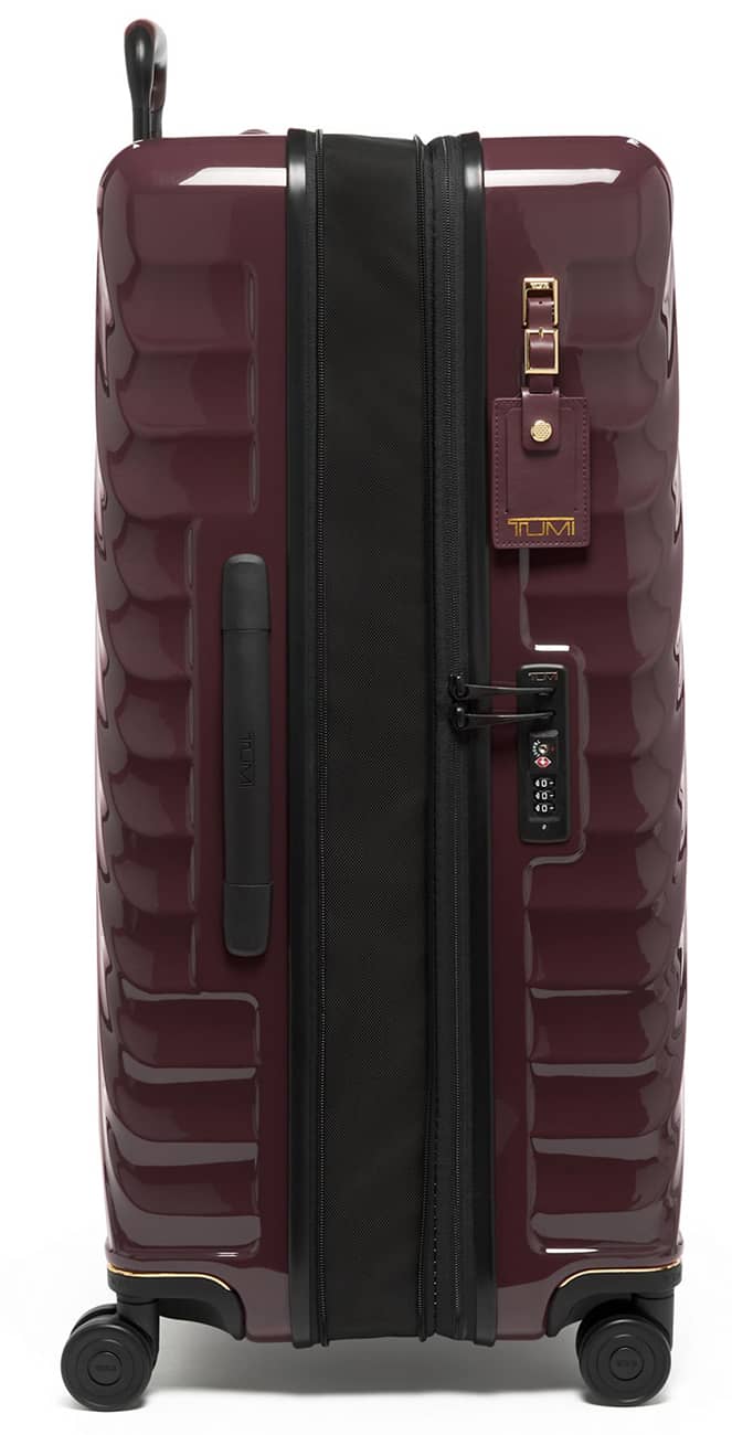 TUMI 19 Degree Extended Trip Expandable 4 Wheeled Packing Case In Beetroot, Model 139686-9880The farther you go, the more stamps on your passport, the better your story. Your 19 Degree luggage is part of that story. Equally striking from a distance or at close range, this expandable packing case boasts a modern silhouette with fluid-looking, angled lines. Made with a recycled polycarbonate shell, it’s lightweight and flexible, yet still durable. It’s ideal for extended business and leisure trips, or for group packing. The smooth and quiet four-wheel system combined with expandable packing ensures effortless travel. Protect what perfects your journey with PROTX2® technology. This item’s lining has been treated with the innovative anti-microbial coating to help prevent the growth of bacteria, mildew and mold that may cause fabric odor on its surface. Features