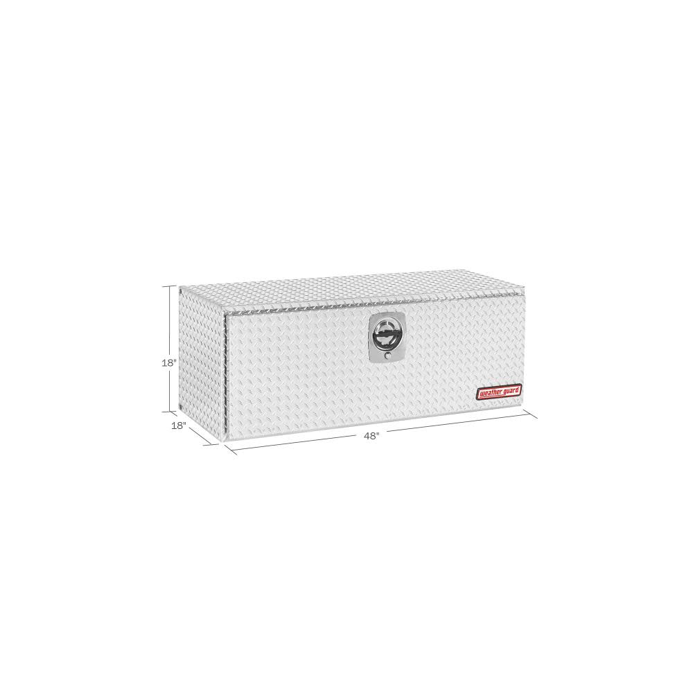 For a flatbed, platform or dump truck, this 8.6 Cu. Ft. WEATHER GUARD underbed truck tool box ensures your large and heavy items are accessible and secure. The aluminum door and hinges reduce weight and protect against corrosion, and the Armor-tuf® clear coat finish ensures years of durability. Your valuable supplies will remain safe, thanks to the heavy-duty three-point latching system, while the stainless steel D-handle creates a tight door seal and is easy to grip, even with gloved hands. To ensure your contents remain dry, a rain gutter channels water and snow off the box and a full weather seal keeps out moisture.