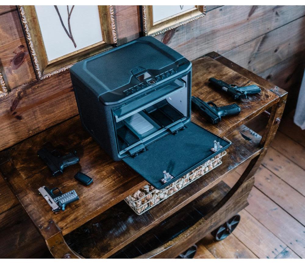 Tough and rugged safe with auto-open lid and rechargeable battery part of Vaultek’s line of rugged safes. Designed to offer custom options the enthusiast gun owner will love. Height adjustable shelf has (3) positions and slides out for convenient access. Modular accessories can clip in where you like for full customization. Twin Pistol Rack with high density foam is included and additional pistol racks and others like magazine racks can be purchased separately. A quick access and secure safe featuring the same signature build quality and precision engineering you expect from Vaultek. Precision engineered 14-gauge steel housing and 12-gauge door opens automatically. Quick access biometric scanner, smart key enabled, backlit numeric keypad, and back up keys for secure access. Biometric scanner stores up to 20 fingerprints. Backlit keypad can be a 4 to 8 digit code. Anti-theft features include anti-pry bars, interior hinges, and dual anti-impact latches. Plus an accelerometer that detects bumps, and impacts and triggers an alarm on the safe. Securely anchor with supplied mounting hardware to mount horizontally or vertically. Integrated smart safe technology raises personal security to a new level with the Vaultek smartphone Bluetooth app allowing you to remotely access the safe within range, check battery level, view safe history log, detect tampering, and customize many safe preferences. Built-in interior LED lights provide high visibility of your items. The backlit keypad illuminates via proximity sensor making it easy to navigate at night and features several hot key entries. The control panel features an LCD screen for prompt safe feedback and status updates. Long lasting rechargeable lithium-ion battery keeps you powered for months on a single charge, and recharges in 2.5 hours. Vaultek is on mission to keep your belongings secure and out of the wrong hands. Great for nightstands, closets, in the kitchen, etc. United states patent number 10,253,529.