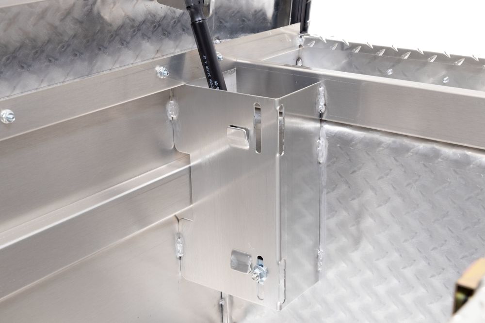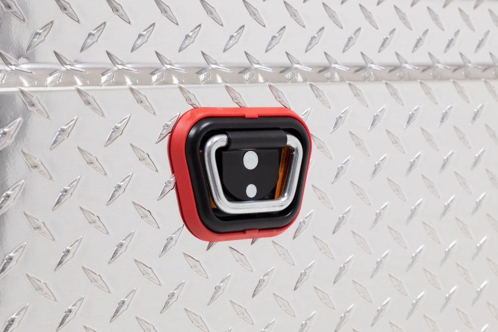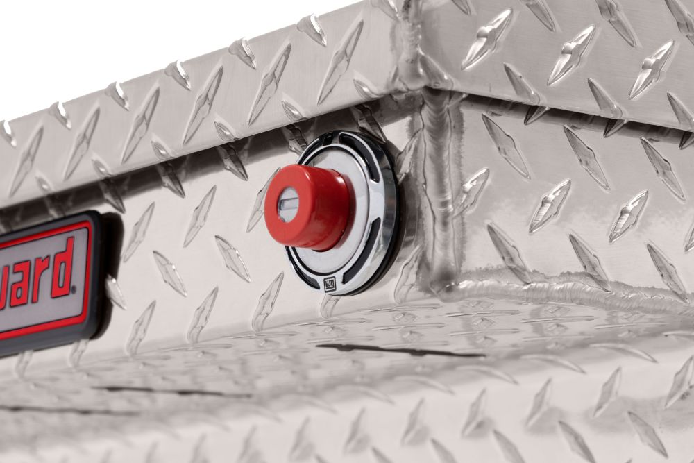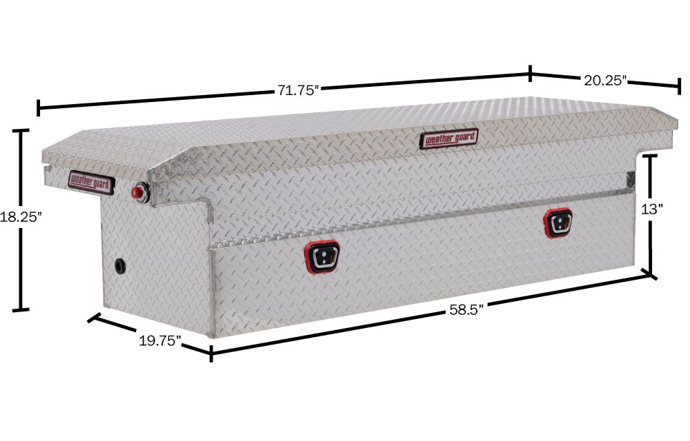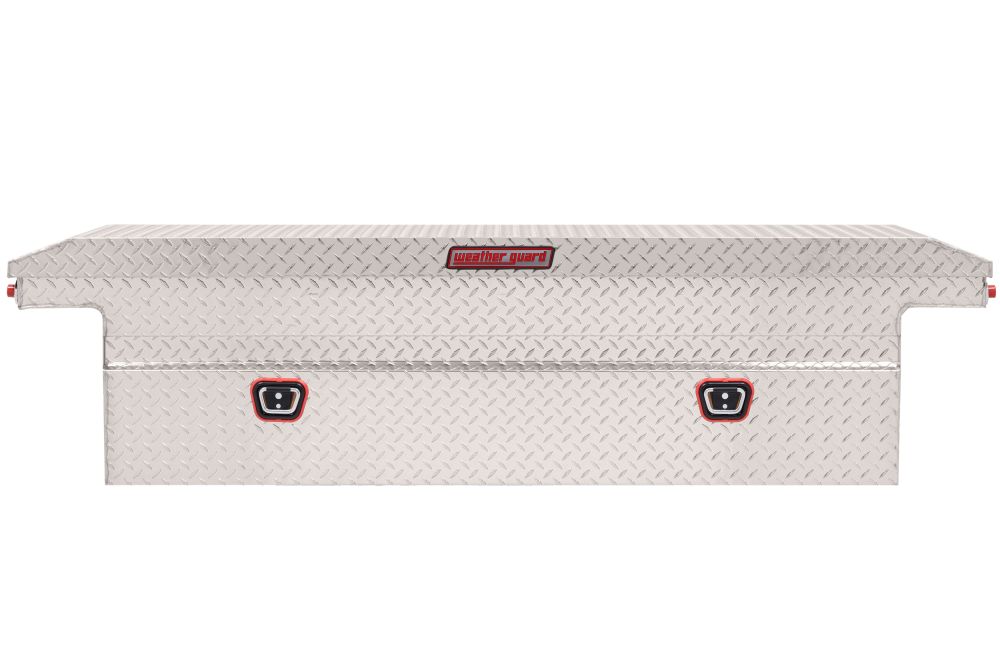 Introducing the re-designed WEATHER GUARD Saddle Box, featuring One Key Simplicity, Improved High Security Locking System, and now PowerSync™ Capable. The Model 121-0-03 is a low profile aluminum truck tool box for full size trucks and is powder coated in a clear ARMOR TUF® finish ensuring years of dependability. The box features the new push button lock that can code multiple boxes on a truck or entire fleet to the same key. The improved high security locking system provides unmatched protection. The box is now compatible with the new PowerSync™ interior lights and remote keyless entry accessories.