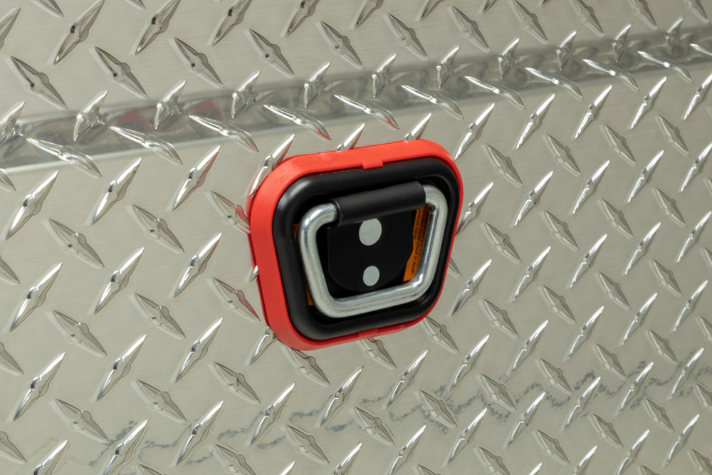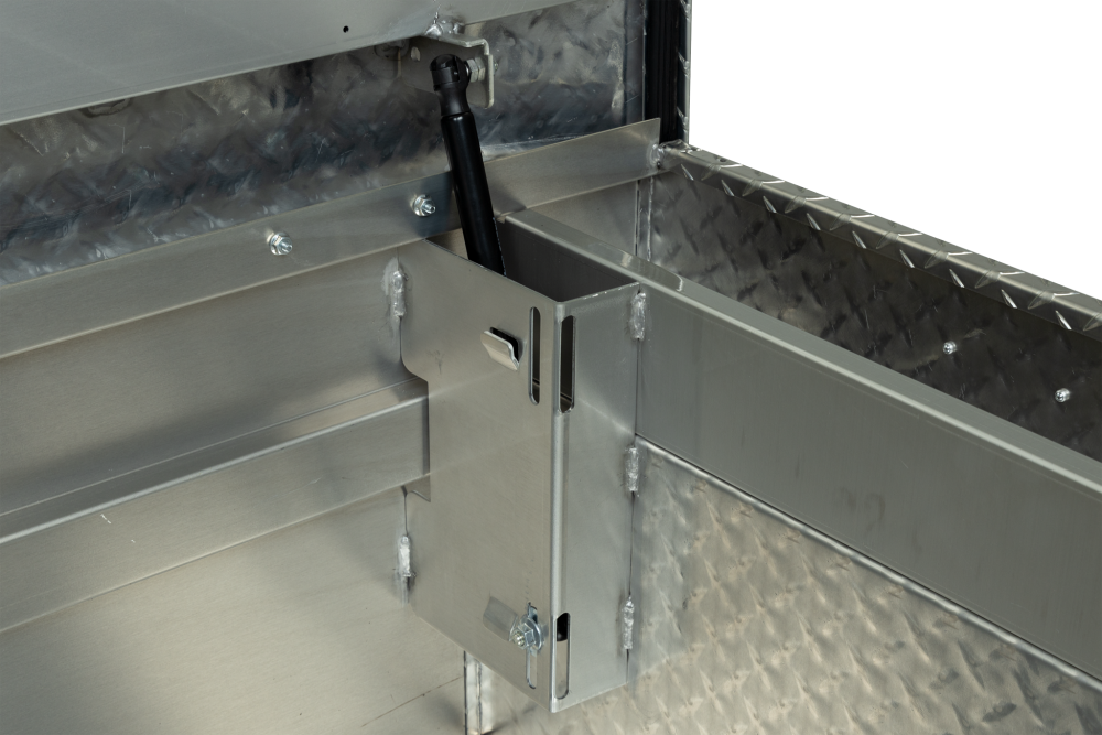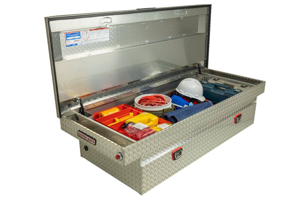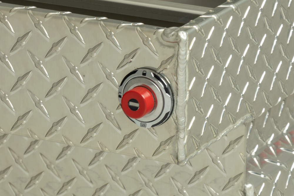 Introducing the re-designed Weather Guard Saddle Box, featuring One Key Simplicity, Improved High Security Locking System, and now PowerSync™ Capable. The Model 117-0-03 is an extra wide aluminum truck tool box for full size trucks and is powder coated in a clear ARMOR TUF® finish ensuring years of dependability. The box features the new push button lock that can code multiple boxes on a truck or entire fleet to the same key. The improved high security locking system provides unmatched protection. The box is now compatible with the new PowerSync™ interior lights & remote keyless entry accessories.