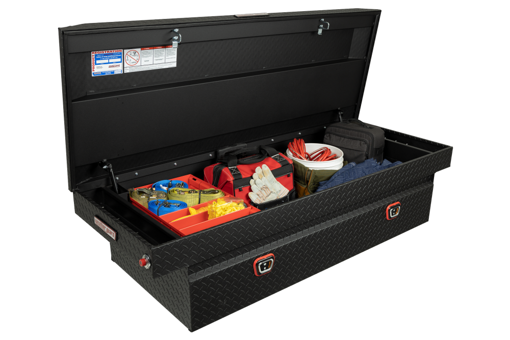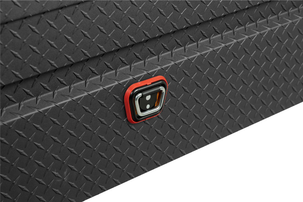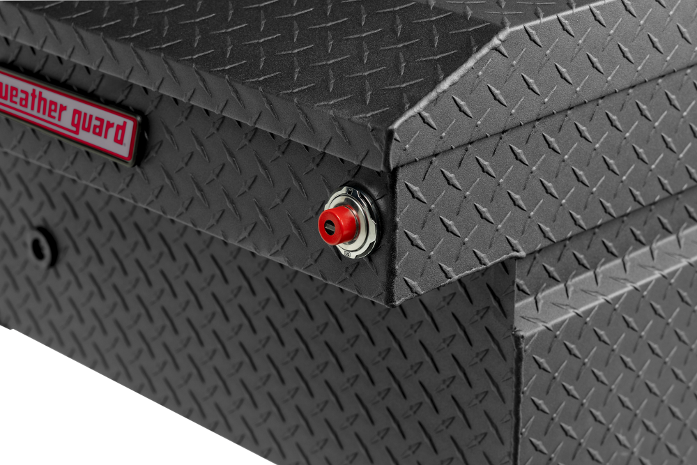 Introducing the re-designed Weather Guard Saddle Box, featuring One Key Simplicity, Improved High Security Locking System, and now PowerSync™ Capable. The Model 117-52-03 is an extra wide aluminum truck tool box for full size trucks and is powder coated in a textured matte black ARMOR TUF® finish ensuring years of dependability. The box features the new push button lock that can code multiple boxes on a truck or entire fleet to the same key. The improved high security locking system provides unmatched protection. The box is now compatible with the new PowerSync™ interior lights & remote keyless entry accessories.