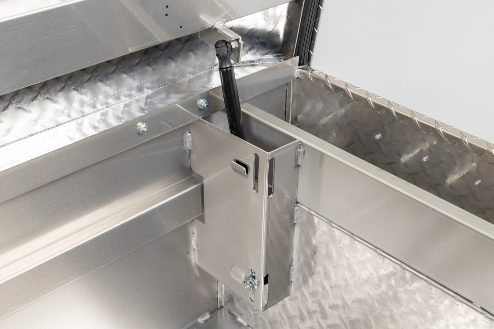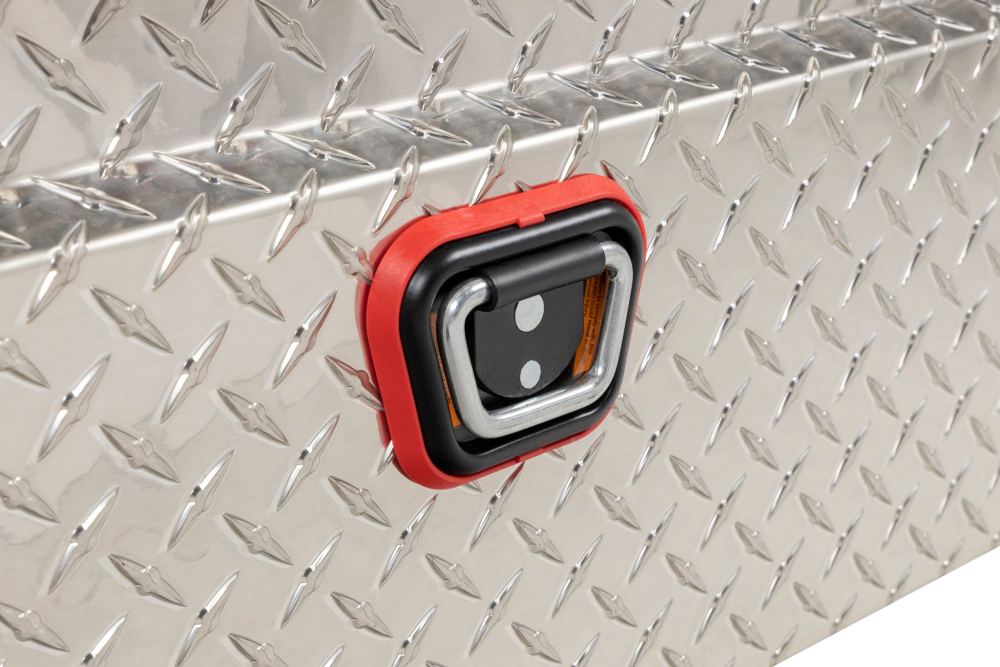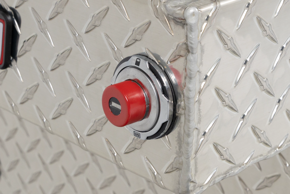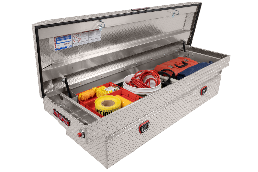 Introducing the re-designed Weather Guard Saddle Box, featuring One Key Simplicity, Improved High Security Locking System, and now PowerSync™ Capable. The Model 127-0-03 is an aluminum truck tool box for full size trucks and is powder coated in a clear ARMOR TUF® finish ensuring years of dependability. The box features the new push button lock that can code multiple boxes on a truck or entire fleet to the same key. The improved high security locking system provides unmatched protection. The box is now compatible with the new PowerSync™ interior lights & remote keyless entry accessories.