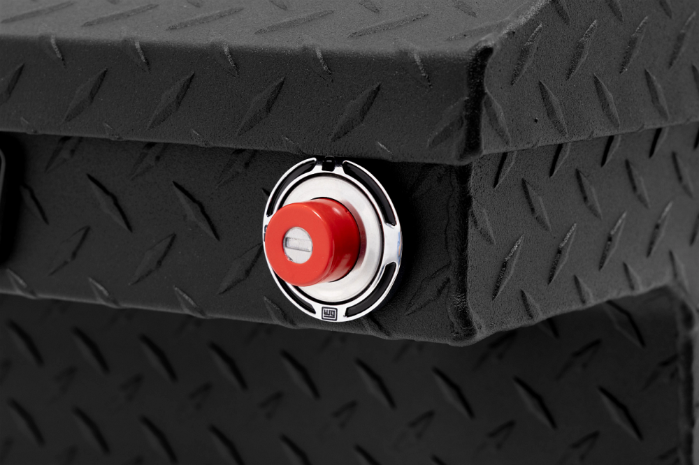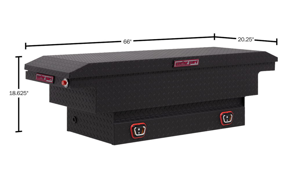 Introducing the re-designed Weather Guard Saddle Box, featuring One Key Simplicity, Improved High Security Locking System, and now PowerSync™ Capable. The Model 131-52-03 is a low profile aluminum truck tool box for compact trucks and is powder coated in a textured matte black ARMOR TUF® finish ensuring years of dependability. The box features the new push button lock that can code multiple boxes on a truck or entire fleet to the same key. The improved high security locking system provides unmatched protection. The box is now compatible with the new PowerSync™ interior lights & remote keyless entry accessories.