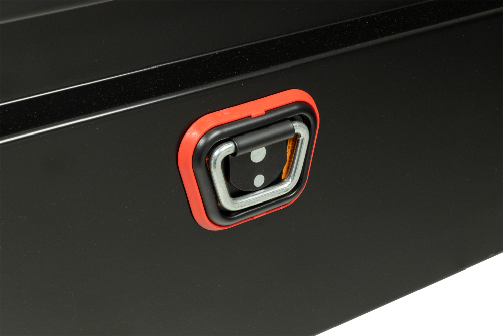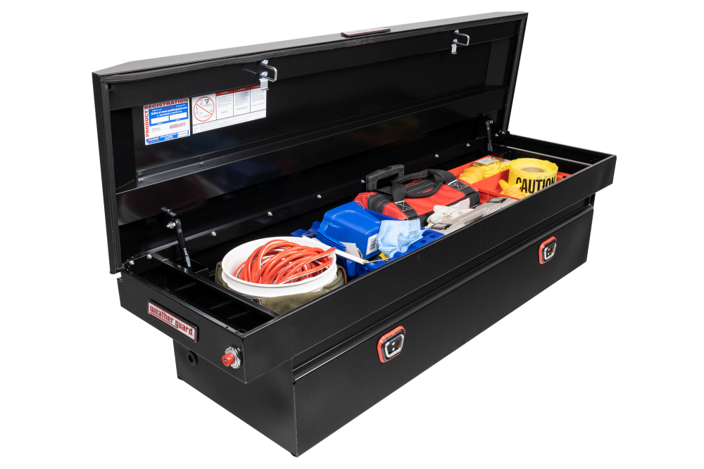 Introducing the re-designed Weather Guard Saddle Box, featuring One Key Simplicity, Improved High Security Locking System, and now PowerSync™ Capable. The Model 126-5-03 is a steel truck tool box for full size trucks and is powder coated in a gloss black ARMOR TUF® finish ensuring years of dependability. The box features the new push button lock that can code multiple boxes on a truck or entire fleet to the same key. The improved high security locking system provides unmatched protection. The box is now compatible with the new PowerSync™ interior lights & remote keyless entry accessories.