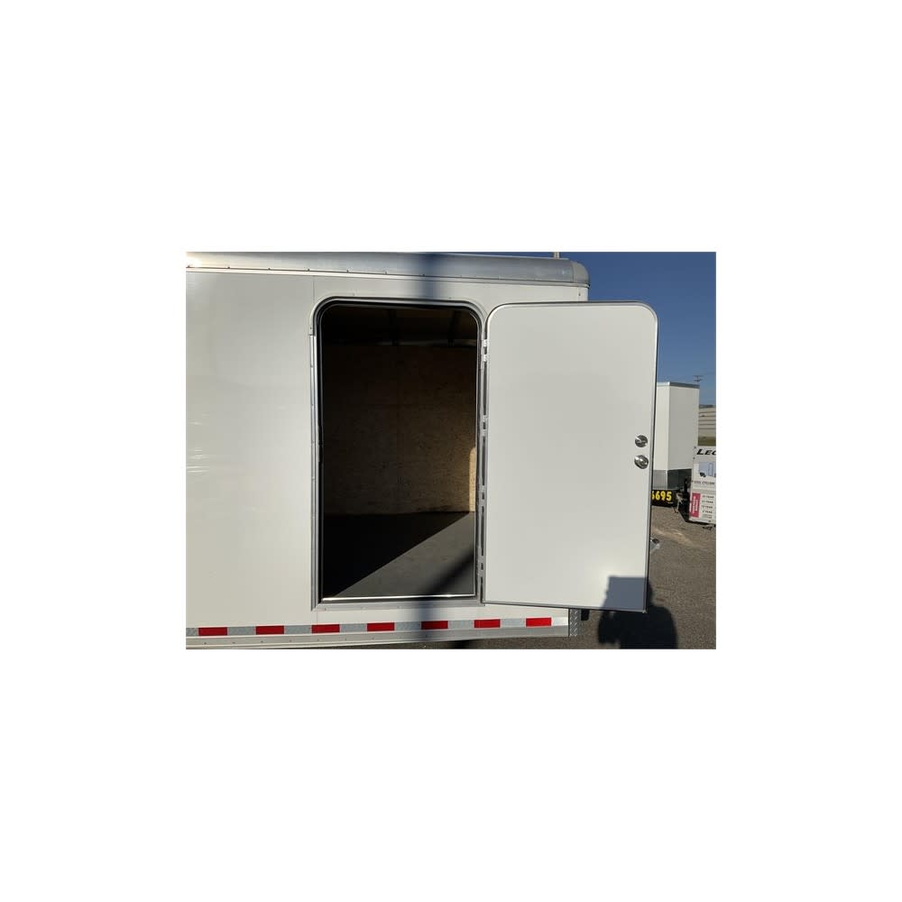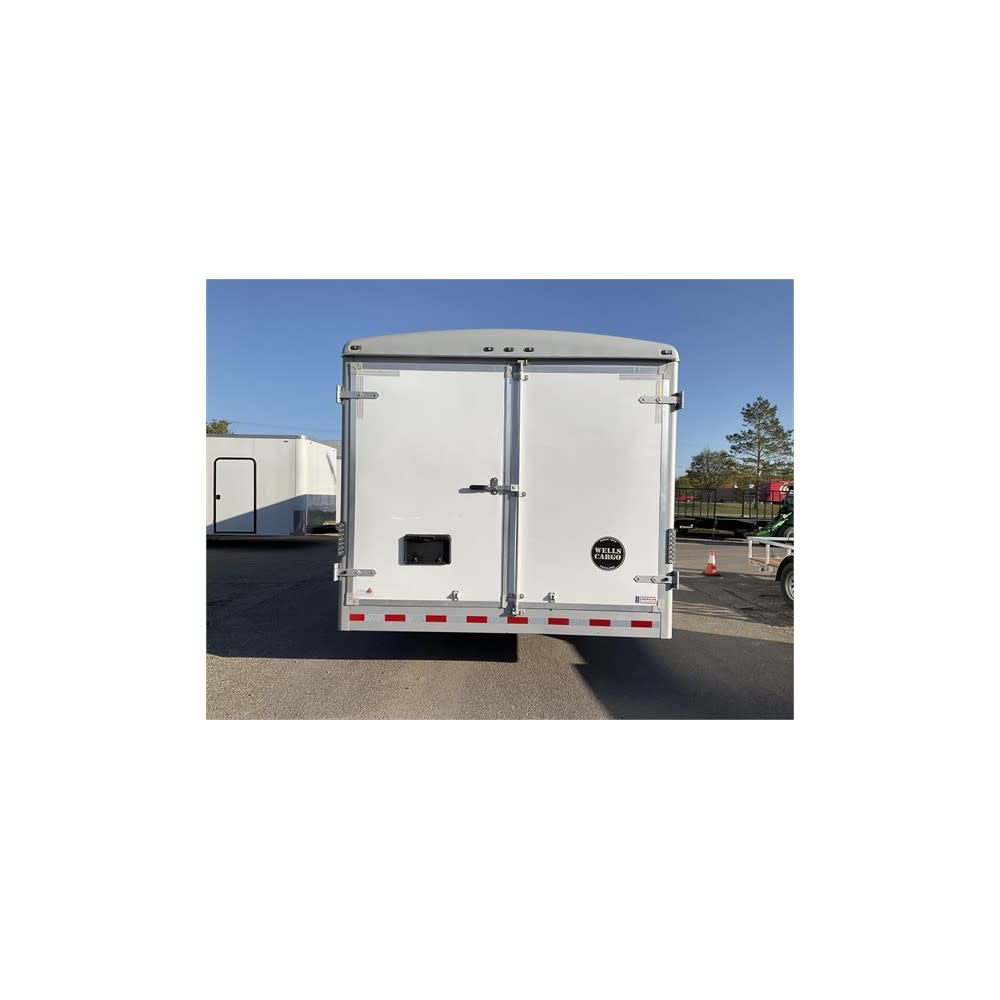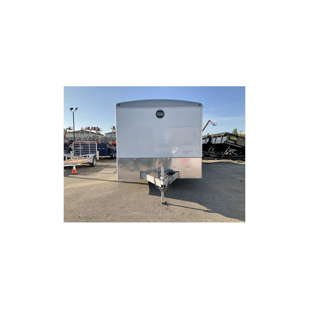 Wells Cargo 28 Ft. enclosed aluminum/steel tandem axle cargo trailer. This is a used Dealer Demo trailer. Flat front, bright diamond plate stone shield, round roof, (2) interior lights with wall switch, curb side access door, rear swing “Barn” doors, silver steel rims. Electric brakes on both axles.