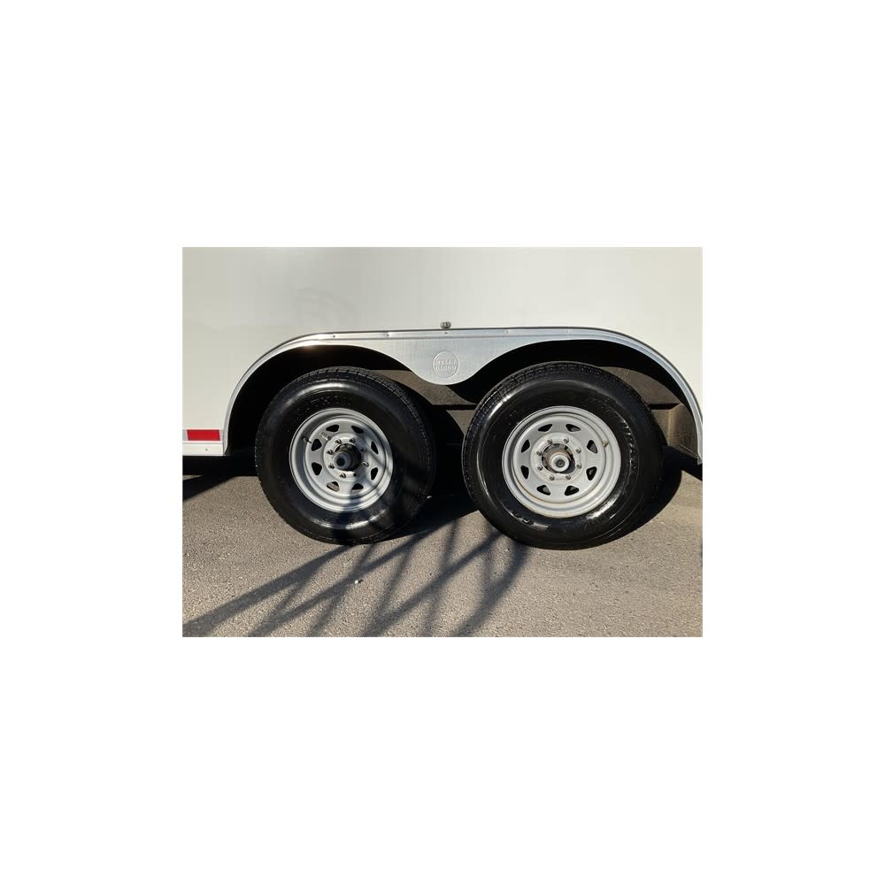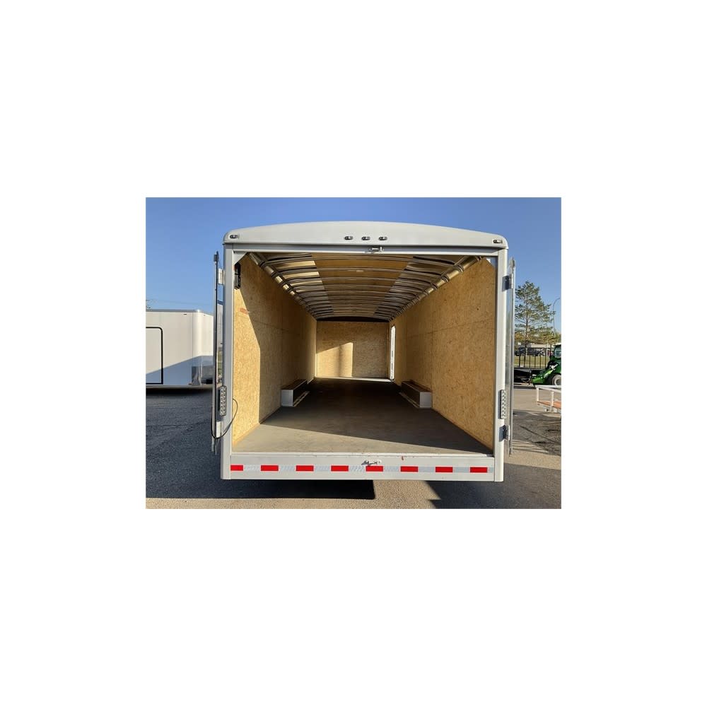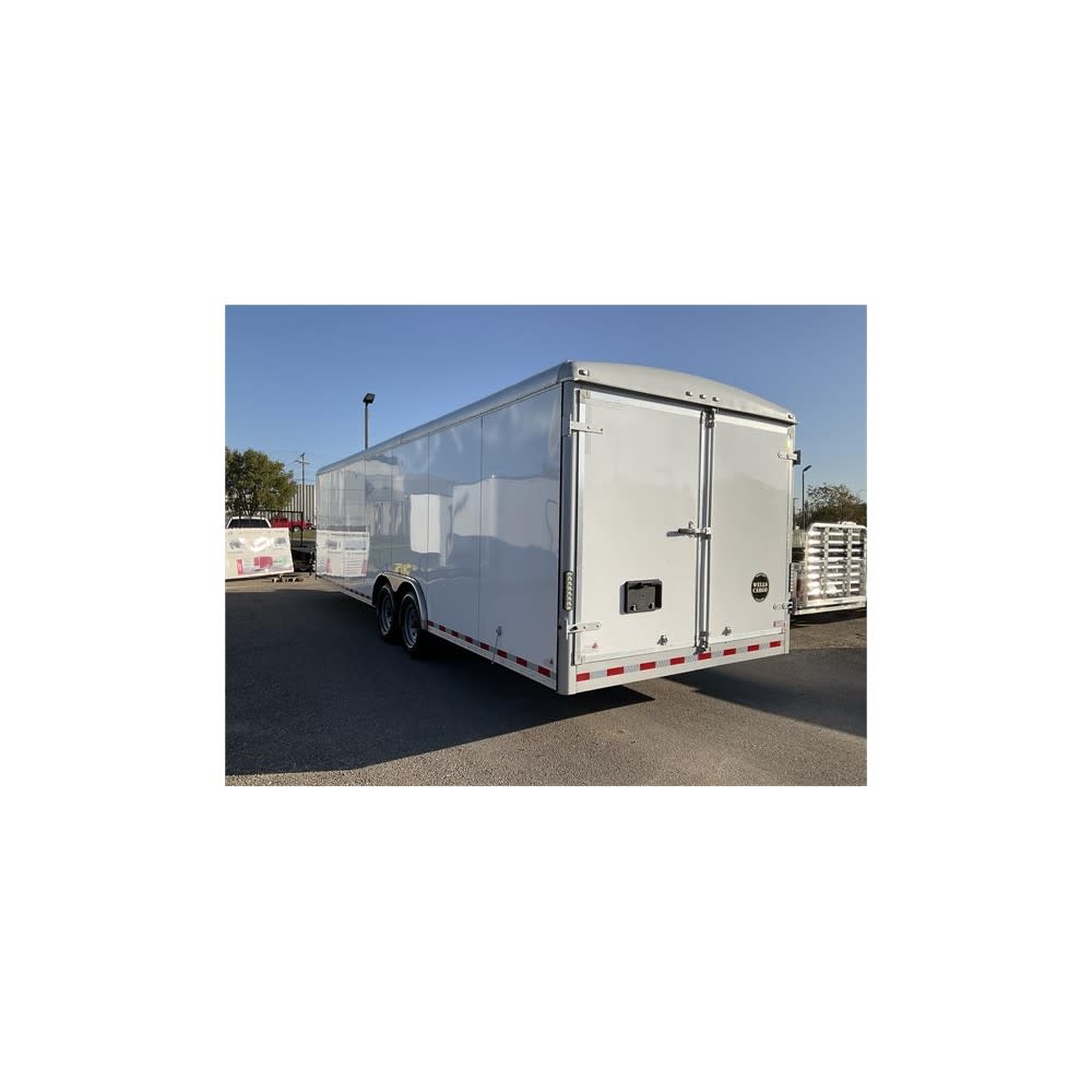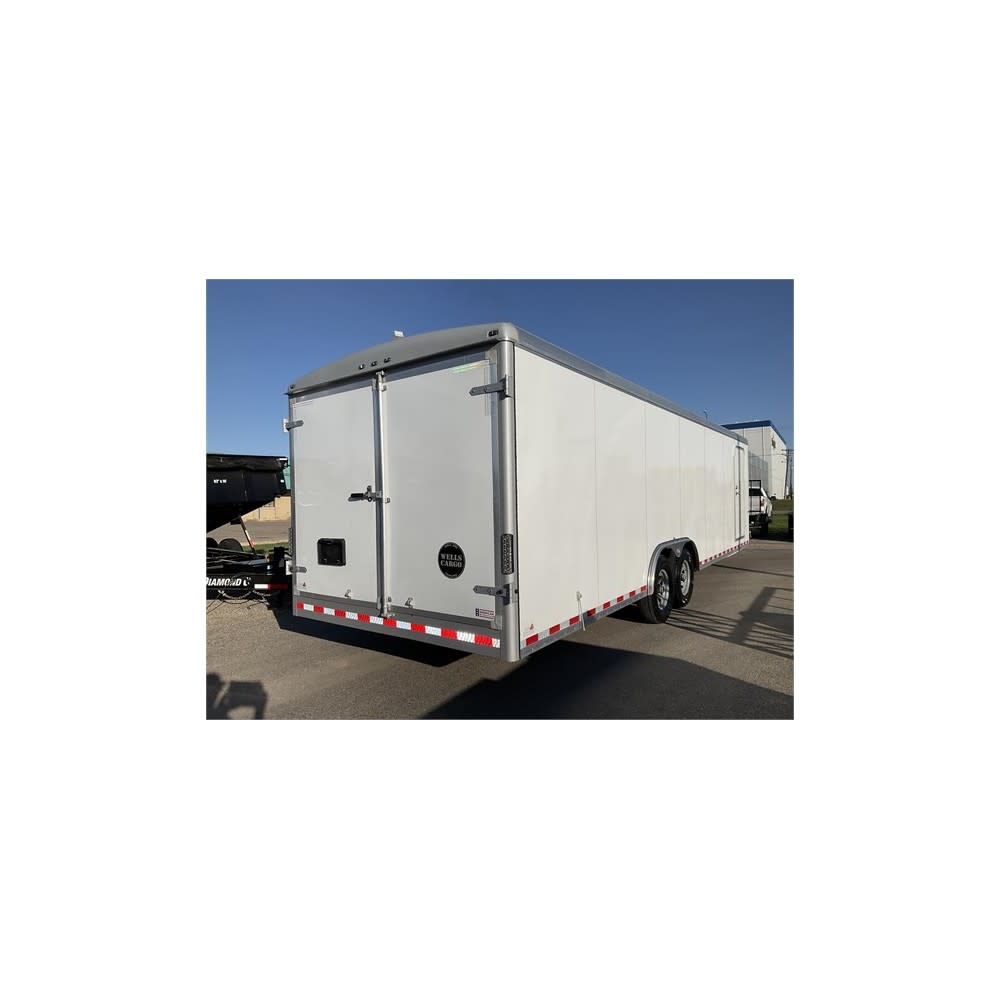 Wells Cargo 28 Ft. enclosed aluminum/steel tandem axle cargo trailer. This is a used Dealer Demo trailer. Flat front, bright diamond plate stone shield, round roof, (2) interior lights with wall switch, curb side access door, rear swing “Barn” doors, silver steel rims. Electric brakes on both axles.