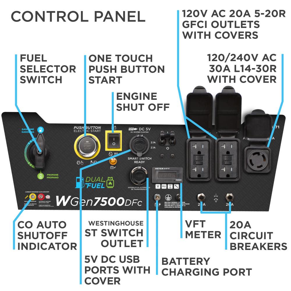 The Westinghouse WGen7500DFc Dual Fuel Portable Generator with CO Sensor is a powerful solution to staying prepared for emergency events. It produces up to 9,500 peak watts and 7,500 running watts, running for up to 11 hours on a 6.6 Gal. (25 L) gasoline fuel tank. Forged with a cast iron sleeve, the WGen7500DFc has a 420cc 4-Stroke OHV Westinghouse Engine constructed for durability. It’s equipped with a built-in fuel gauge, automatic low oil shutdown, and GFCI household outlets for added protection. The WGen7500DFc features Push-Button Electric Start which conveniently pairs with a wireless remote key fob for effortless ignition, and as a dual fuel generator, the WGen7500DFc operates on gasoline or propane (LPG) for versatility. The L14-30R outlet is Transfer Switch Ready, connecting straight to your home for total household power and eliminating the hassle for annoying extension cords or power strips. The WGen7500DFc is easy to care for with a VFT Data Center to share real-time updates on maintenance information, ensuring long life and lasting utility. A hardened-steel frame with added roll bars, foam grip handle, and never-flat wheels lets you easily transport this generator on the go. The WGen7500DFc is complete with a 3-Year Limited Warranty and Lifetime Technical Support backed by our nationwide customer service and support network.