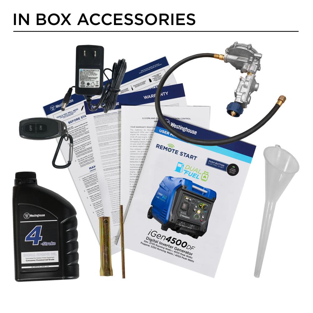 The Westinghouse iGen4500DF Dual Fuel Inverter Generator is a premium power solution to meet your portable power needs whether you’re camping or on the go. With a TT-30R RV Ready Outlet, two 20A household outlets, and built-in USB ports, this generator is ideal for recreational activities or as an emergency backup source. It’s engineered for maximum fuel efficiency with variable engine speed to produce only the power you need at any given time, running up to 18 hours on a 3.4-gallon gas tank. As a dual fuel generator, the iGen4500DF operates on gasoline or propane for versatility wherever you are. Conveniently built with Push-Button Electric Start and wireless remote start for easy ignition and has an LED Data Center with an automatic rotating digital display to keep you up to date with real-time information. At less than 3% THD, the iGen4500DF is perfect for running sensitive electronics like LCD/plasma televisions, laptops, tablets, or mobile devices that require clean, stable power. It features a lightweight, compact design with wheels and an extendable suitcase-style handle, making this model effortlessly more portable than traditional generators. The iGen4500DF is ensured by a 3-year warranty from a nationwide service network and lifetime technical support.