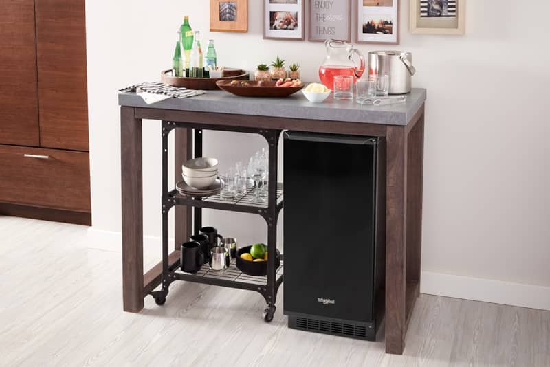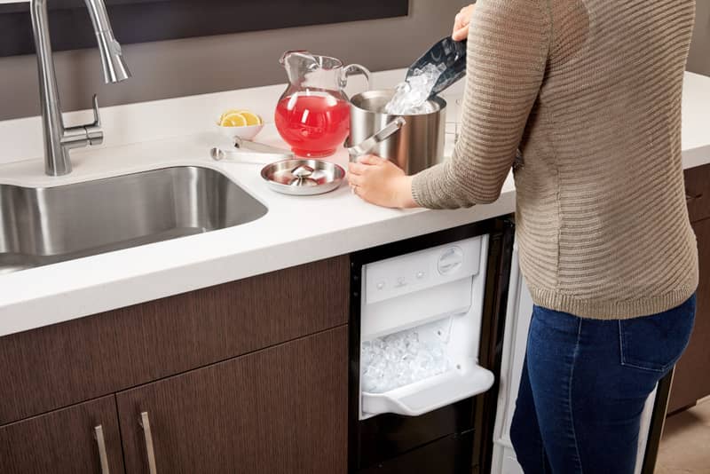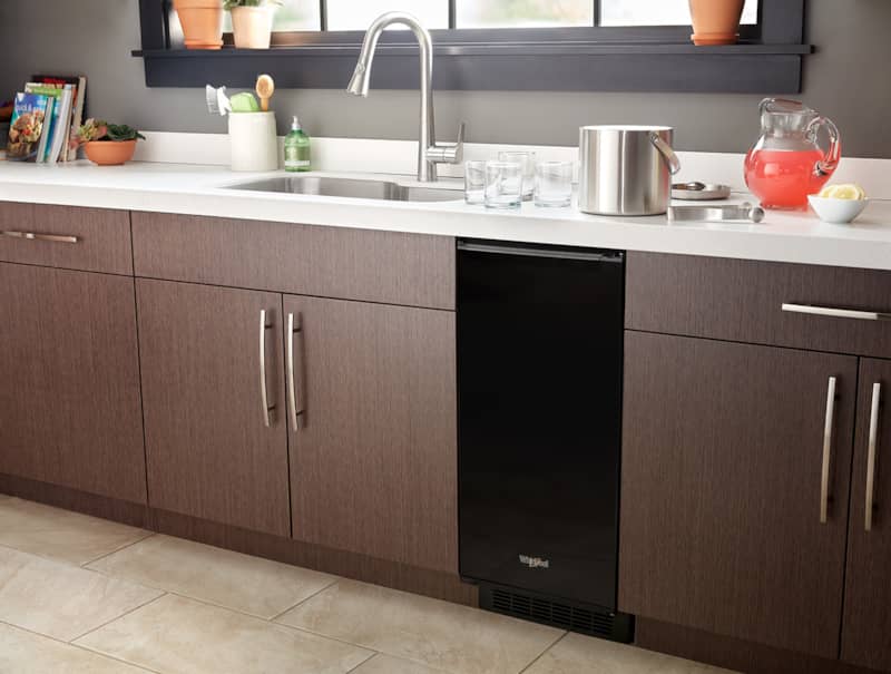 Whirlpool WUI75X15HB 15″ Black Icemaker With Clear Ice TechnologyKeep plenty of fresh ice on hand, wherever you need it most, with icemakers that store up to 25 pounds of ice and can be installed under a counter or on their own. Clear Ice Technology removes the gases and impurities in ice that cause cloudiness and foaming in carbonated drinks, while the Fast Ice Option speeds up ice production. Also, an easy-to-use Ice Scoop lets you quickly serve up cold beverages or fill coolers. Features