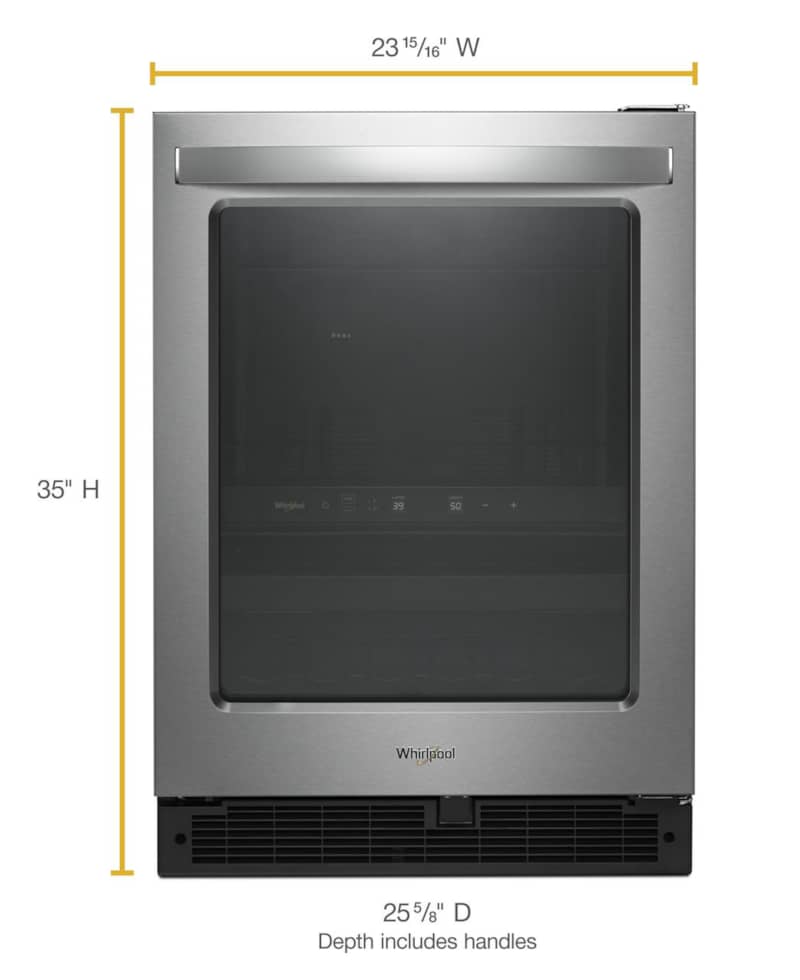 Whirlpool Stainless Steel Undercounter Beverage CenterWhether it’s wine, craft beer or sparkling water, this stainless steel Whirlpool beverage center can adequately store a variety of drinks. With space to store up to 14 bottles of wine, you can keep a variety of vintages on hand for all kinds of cuisines or taste preferences. If you love a dry pinot grigio but your spouse loves a rich, bold cabernet, you can easily store both in the same appliance: the dual-temperature zone lets you choose two custom temperatures inside the appliance for different storage needs. The bottom shelves on this Whirlpool beverage center are designed specifically for wine bottles and other glass bottles in order to maintain their freshness; as proper storage is crucial for storing wine, this fridge is a must for entertaining. With brilliant LED interior lighting, you and your guests can easily see what’s inside. Ideal Beverage Storage for EntertainingThis Whirlpool beverage center is an ideal storage solution for households that entertain often. Its reversible glass door can be installed on either side of the appliance to accommodate any space. The fingerprint resistant design hides smudges and is easy to clean so you can keep your entertaining space looking its best. If you need to change the temperature of the upper and lower zone, do so easily thanks to the front-facing electronic controls; the temperature sensor alert will notify you if one of those temperatures is rising so you can prevent items from going bad. Whether it’s in a dining room, game room or man cave, this wine refrigerator makes a welcome addition. You can even install one of these units in your kitchen if you need to maximize food storage in your Whirlpool refrigerator. If you have any questions about this Whirlpool wine refrigerator, please contact our appliance experts at 800-860-3577. Our refrigerator buying guide also contains more information about these wine fridges. Features