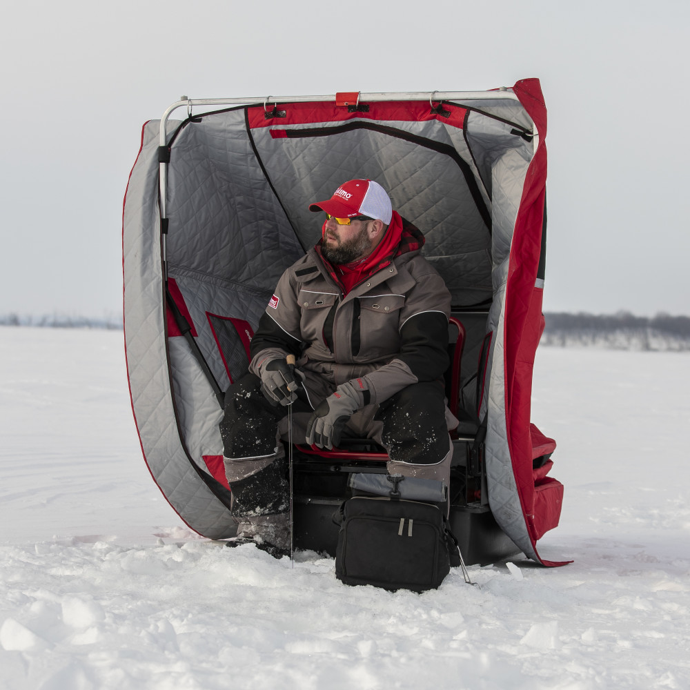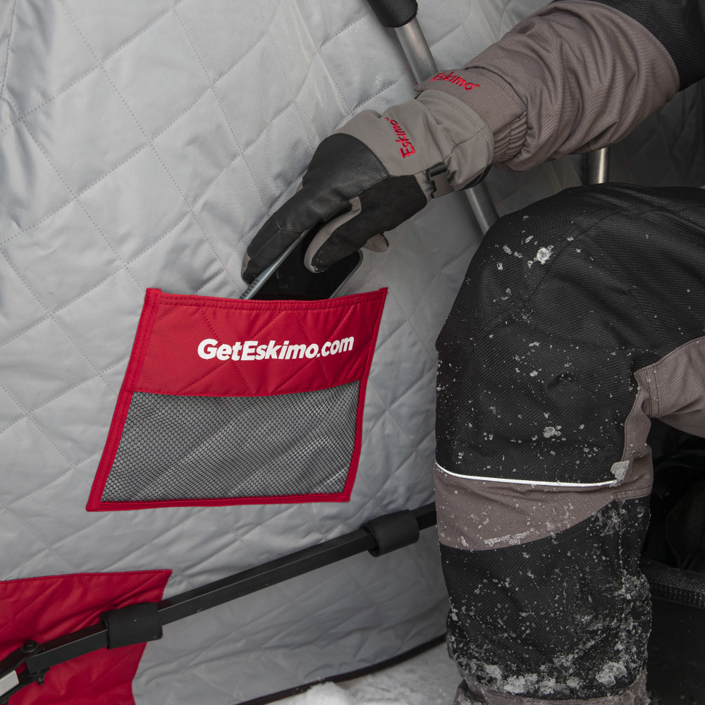 The fully-insulated Eskimo Wide1 Inferno is an expandable wide-bottom one-man flip-style shelter. Its patented design gives anglers more fishable space, while maintaining the lightweight portability of a one-man shelter thanks to a telescoping front end. Once the front end is expanded, users can fish multiple lines and still have room for electronics and a heater. A larger sled on the Wide1 Inferno creates more fishable area with 14.8 square feet and 60 inches of height for setting hooks. The new mounted swivel Versa Seat is comfortable for hours on end and allows for easy movement while seated.